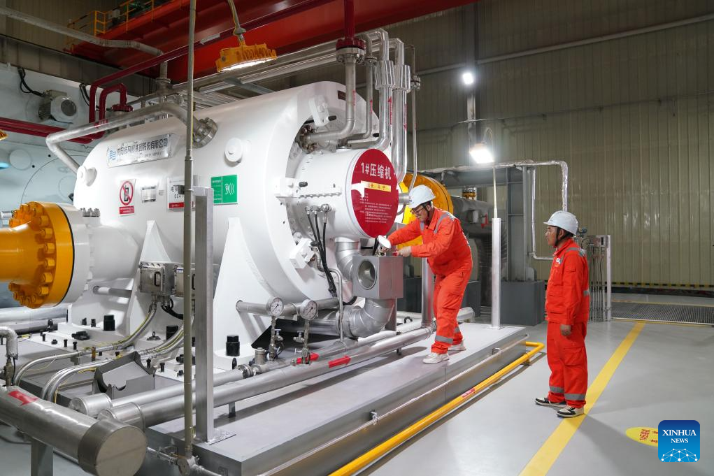 Workers maintain a compressor at a gas transmission pipeline station in Heihe, northeast China's Heilongjiang Province, July 9, 2025. As of July 10, the cumulative gas transmission volume of the China-Russia east-route natural gas pipeline's China section has surpassed 100 billion cubic meters. The pipeline's China section begins in Heihe, a city in the country's northeast bordering Russia, and transports natural gas from Siberia all the way south to Shanghai, China's economic and financial hub. (Xinhua/Wang Song)