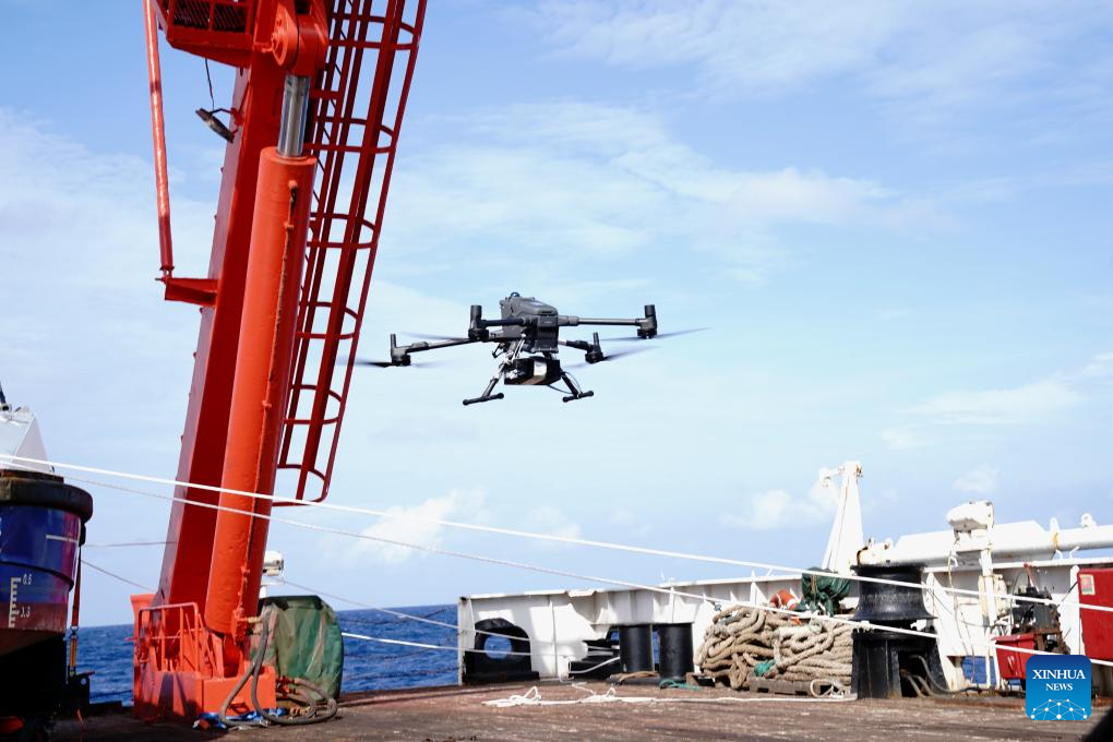 An intelligent seawater sampling unmanned aerial vehicle (UAV) departs from the "Xiangyanghong 10" in the northern waters of the South China Sea, July 9, 2025. Chinese researchers successfully carried out scientific tests involving various types of drones, unmanned surface vessels, and autonomous underwater vehicles aboard the "Xiangyanghong 10" in the northern waters of the South China Sea in recent days.