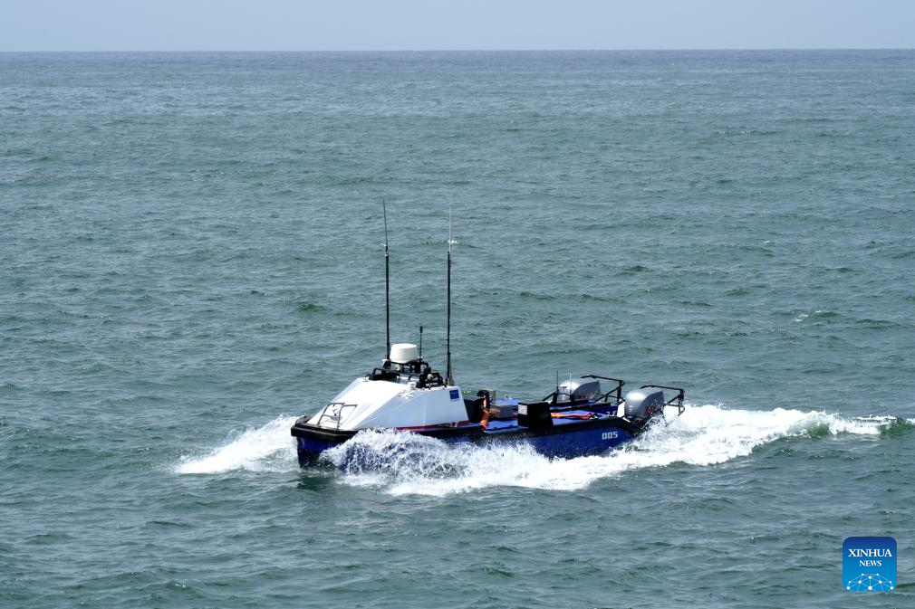 An unmanned survey vessel conducts scientific research in the northern waters of the South China Sea, July 9, 2025. Chinese researchers successfully carried out scientific tests involving various types of drones, unmanned surface vessels, and autonomous underwater vehicles aboard the "Xiangyanghong 10" in the northern waters of the South China Sea in recent days.