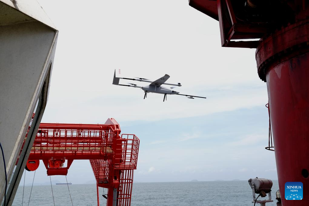 A thermal-imaging surveillance unmanned aerial vehicle (UAV) takes off from the "Xiangyanghong 10" to conduct scientific research in the northern waters of the South China Sea, July 8, 2025. Chinese researchers successfully carried out scientific tests involving various types of drones, unmanned surface vessels, and autonomous underwater vehicles aboard the "Xiangyanghong 10" in the northern waters of the South China Sea in recent days.