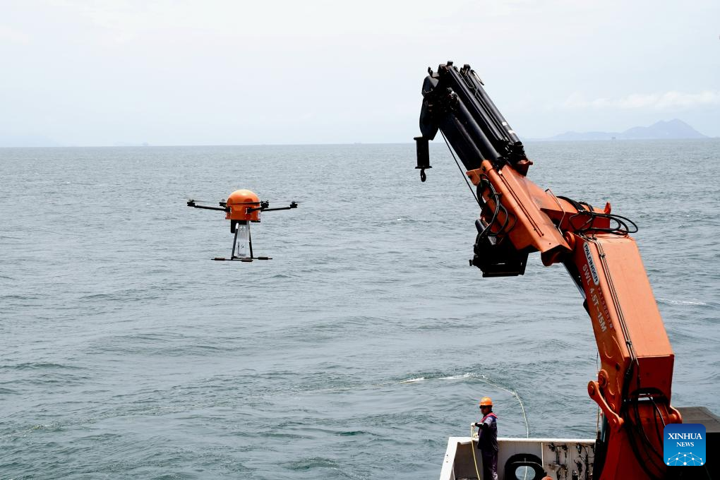 A cross-domain robot takes off from the "Xiangyanghong 10" to conduct scientific research in the northern waters of the South China Sea, July 8, 2025. Chinese researchers successfully carried out scientific tests involving various types of drones, unmanned surface vessels, and autonomous underwater vehicles aboard the "Xiangyanghong 10" in the northern waters of the South China Sea in recent days.