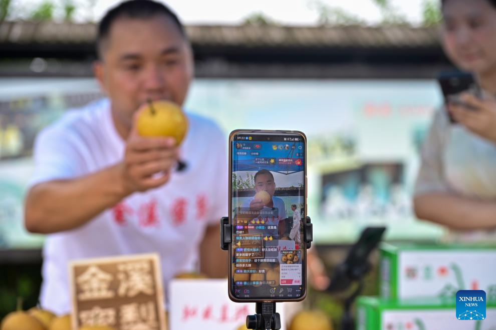 A livestreamer promotes local specialty fruit in Zhuqiao Village, Jinxi County of Fuzhou, east China's Jiangxi Province, July 9, 2025. Jinxi County, with centuries-long history, still preserves over 100 ancient villages dating back to the Ming and Qing dynasties (1368-1911), which has won the county fame as an "ancient village museum without bounding walls." Zhuqiao is a prominent representative among the villages, featuring 109 existing ancient buildings from the Ming and Qing dynasties.