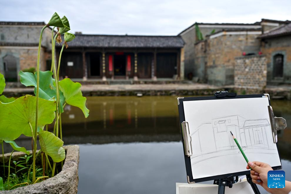 A teenager sketches an ancient building in Zhuqiao Village, Jinxi County of Fuzhou, east China's Jiangxi Province, July 9, 2025. Jinxi County, with centuries-long history, still preserves over 100 ancient villages dating back to the Ming and Qing dynasties (1368-1911), which has won the county fame as an "ancient village museum without bounding walls." Zhuqiao is a prominent representative among the villages, featuring 109 existing ancient buildings from the Ming and Qing dynasties.