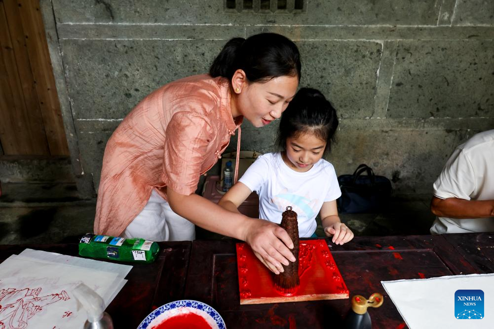 A child learns about woodblock printing technique in Zhuqiao Village, Jinxi County of Fuzhou, east China's Jiangxi Province, July 9, 2025. Jinxi County, with centuries-long history, still preserves over 100 ancient villages dating back to the Ming and Qing dynasties (1368-1911), which has won the county fame as an "ancient village museum without bounding walls." Zhuqiao is a prominent representative among the villages, featuring 109 existing ancient buildings from the Ming and Qing dynasties.