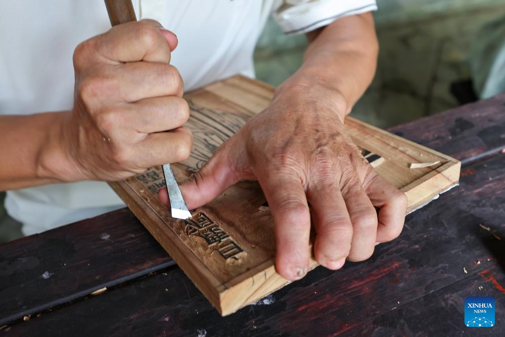 An artisan demonstrates woodblock printing technique in Zhuqiao Village, Jinxi County of Fuzhou, east China's Jiangxi Province, July 9, 2025. Jinxi County, with centuries-long history, still preserves over 100 ancient villages dating back to the Ming and Qing dynasties (1368-1911), which has won the county fame as an "ancient village museum without bounding walls." Zhuqiao is a prominent representative among the villages, featuring 109 existing ancient buildings from the Ming and Qing dynasties.