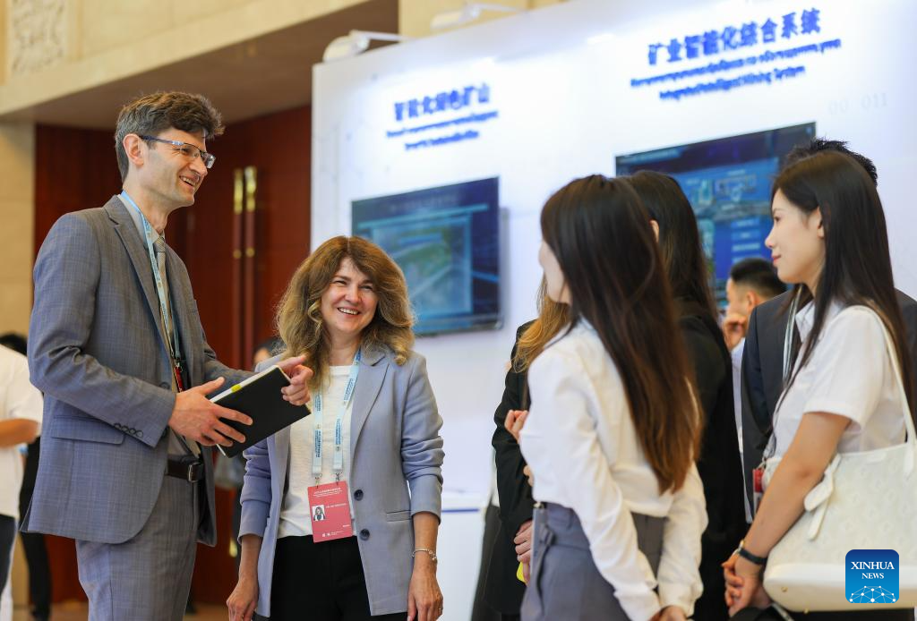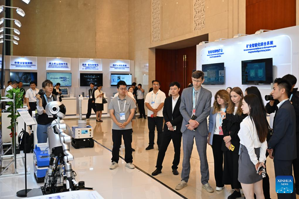 Guests and exhibitors communicate at the interactive experience zone during the 2025 Shanghai Cooperation Organization (SCO) Digital Economy Forum in north China's Tianjin, July 11, 2025. Themed "New Bonds in the Digital Economy, New Horizons for Cooperation," the forum was held here Friday. (Xinhua/Sun Fanyue)