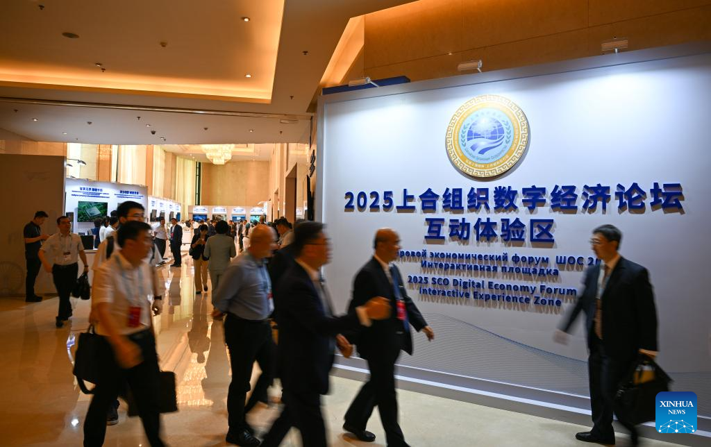 Guests visit the interactive experience zone during the 2025 Shanghai Cooperation Organization (SCO) Digital Economy Forum in north China's Tianjin, July 11, 2025. Themed "New Bonds in the Digital Economy, New Horizons for Cooperation," the forum was held here Friday. (Xinhua/Zhao Zishuo)