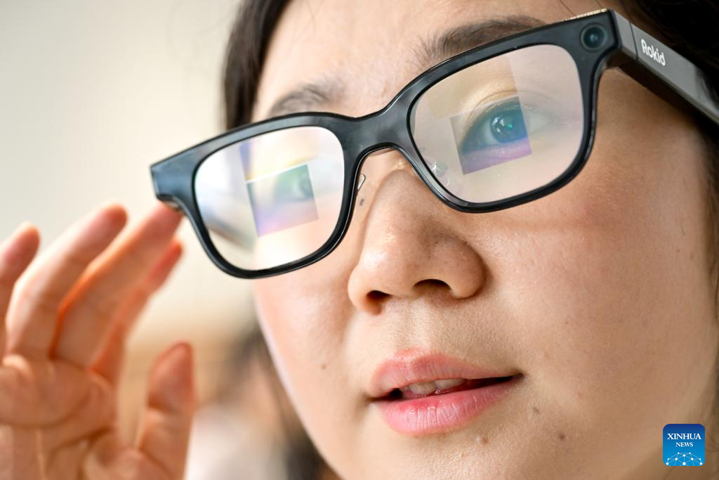 A staff member demonstrates a pair of smart glasses developed by Hangzhou-based technology company Rokid at Rokid's flagship store in Yujiang District of Yingtan, east China's Jiangxi Province, July 10, 2025. The eyewear industry is a traditional sector in Yujiang District, with sales organizations dating back to the Qing Dynasty (1644-1911). Today, Yujiang ranks among the top eyewear industry bases in China, attracting numerous well-known enterprises. From handcrafted eyewear over 200 years ago to the smart glasses today, Yujiang has written a centuries-long legend in the field of optics. (Xinhua/Liu Jinhai)