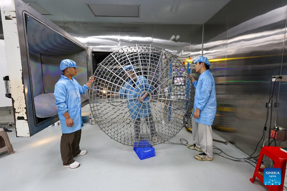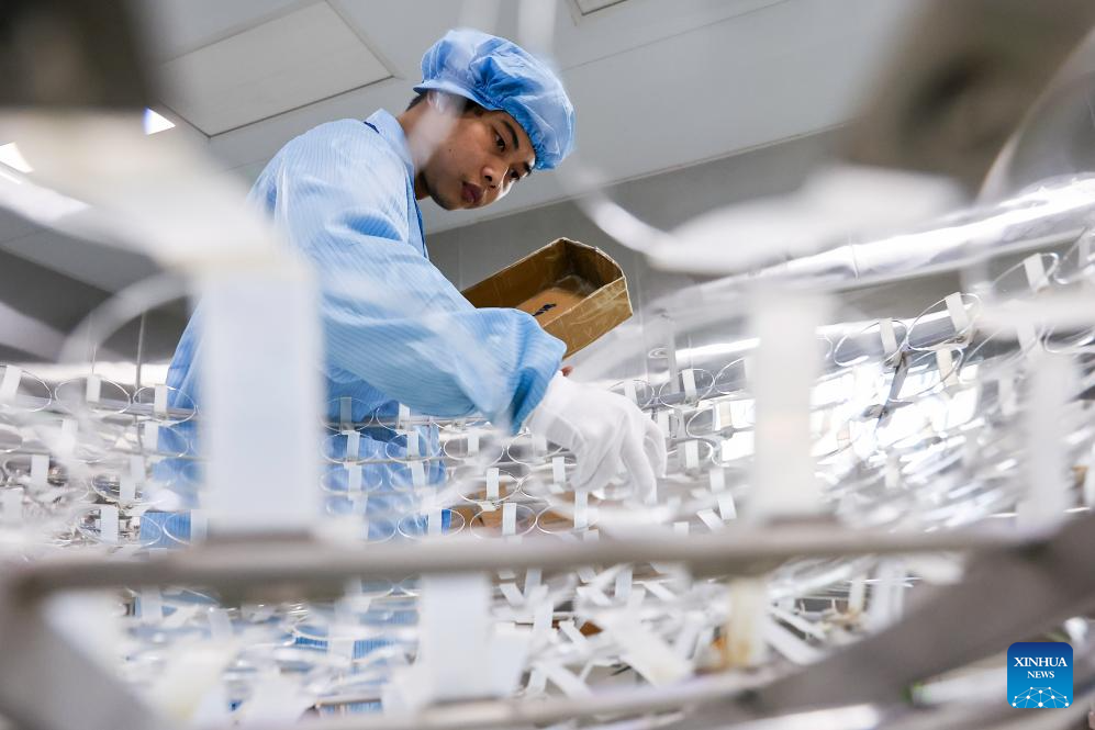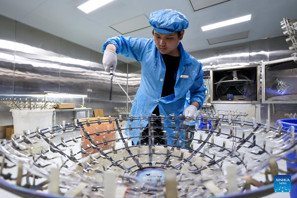 A staff member places lenses on a coating rack at the workshop of Keqiang Optics Co., Ltd. in Yujiang District of Yingtan, east China's Jiangxi Province, July 10, 2025. The eyewear industry is a traditional sector in Yujiang District, with sales organizations dating back to the Qing Dynasty (1644-1911). Today, Yujiang ranks among the top eyewear industry bases in China, attracting numerous well-known enterprises. From handcrafted eyewear over 200 years ago to the smart glasses today, Yujiang has written a centuries-long legend in the field of optics. (Xinhua/Liu Jinhai)