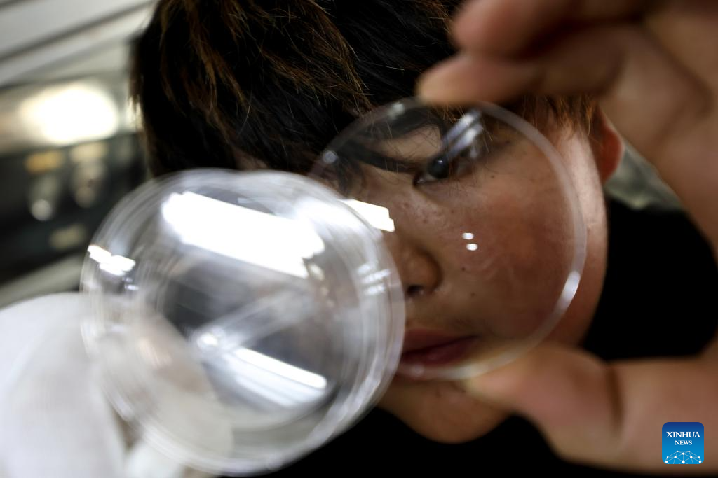 A staff member observes lenses at the workshop of Keqiang Optics Co., Ltd. in Yujiang District of Yingtan, east China's Jiangxi Province, July 10, 2025. The eyewear industry is a traditional sector in Yujiang District, with sales organizations dating back to the Qing Dynasty (1644-1911). Today, Yujiang ranks among the top eyewear industry bases in China, attracting numerous well-known enterprises. From handcrafted eyewear over 200 years ago to the smart glasses today, Yujiang has written a centuries-long legend in the field of optics. (Xinhua/Liu Jinhai)