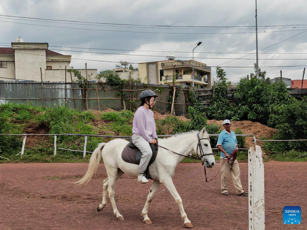 This photo taken with a mobile phone shows a tourist learning to ride a horse at an equestrian club in Addis Ababa, Ethiopia, on Sept. 22, 2024. The United Nations General Assembly adopted a resolution on June 3, 2025, declaring July 11 "World Horse Day" to celebrate the role of horses and to tackle the challenges they face in the modern world. (Xinhua/Liu Fangqiang)