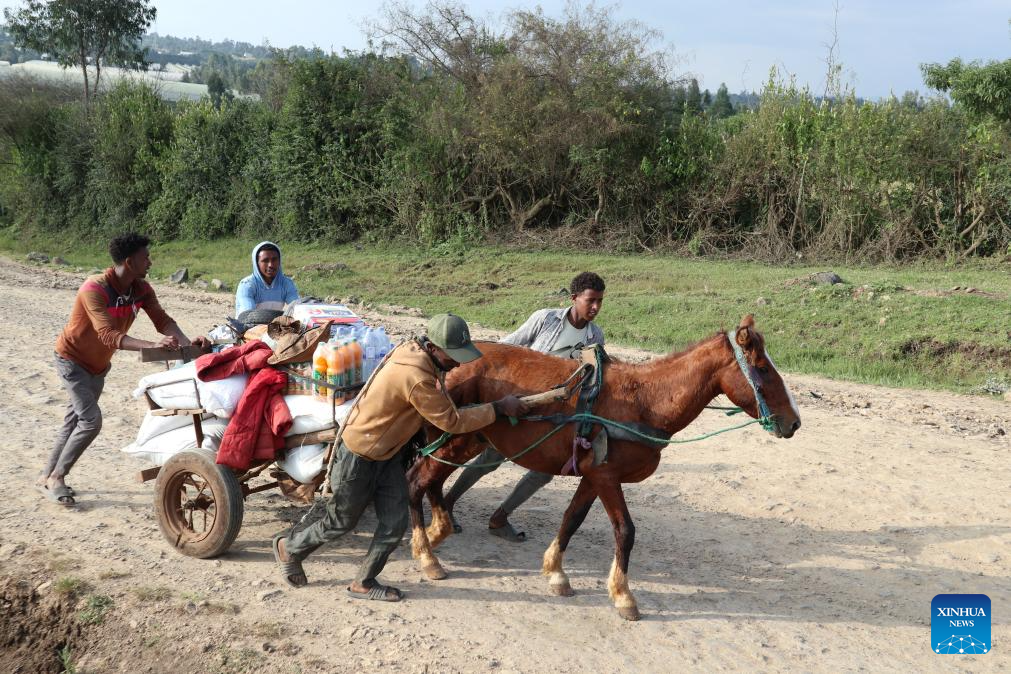 People transport goods with a horse cart on the outskirt of Addis Ababa, Ethiopia, on Nov. 12, 2024. The United Nations General Assembly adopted a resolution on June 3, 2025, declaring July 11 "World Horse Day" to celebrate the role of horses and to tackle the challenges they face in the modern world. (Xinhua/Liu Fangqiang)