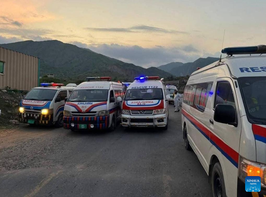 This photo taken with mobile phone on July 11, 2025 shows ambulances near the attack site in Loralai district of Balochistan province, Pakistan. At least nine passengers were abducted and shot dead after gunmen intercepted at least two buses in Pakistan's southwestern Balochistan province, the spokesperson of the provincial government confirmed on Friday.