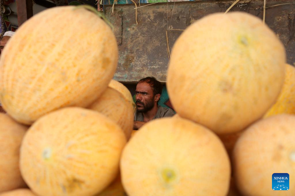 A vendor sells melons at a local market in Kabul, Afghanistan, July 10, 2025. Melon is one of Afghanistan's most renowned and widely exported fruits, cultivated across various provinces in the country. Afghanistan's hot and dry climate provides ideal conditions for growing fragrant and sweet melons. (Photo by Saifurahman Safi/Xinhua)