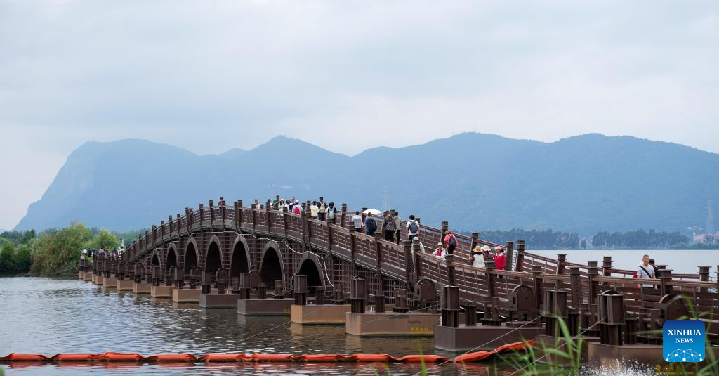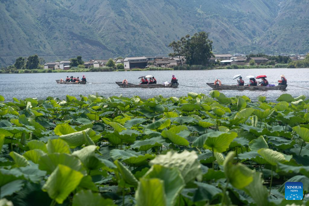 Tourists ride boats in Dali Bai Autonomous Prefecture, southwest China's Yunnan Province, July 12, 2025. Tourist destinations in Yunnan entered their peak tourism season as summer vacation began. (Photo by Luo Xincai/Xinhua)