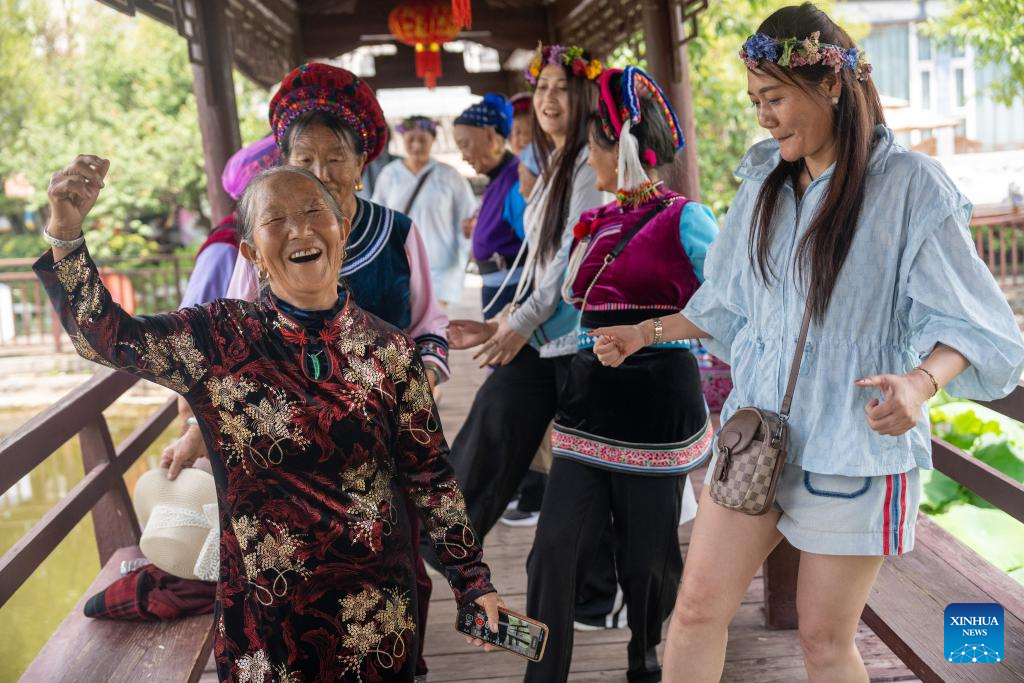 Tourists dance with local people in Dali Bai Autonomous Prefecture, southwest China's Yunnan Province, July 12, 2025. Tourist destinations in Yunnan entered their peak tourism season as summer vacation began. (Photo by Luo Xincai/Xinhua)