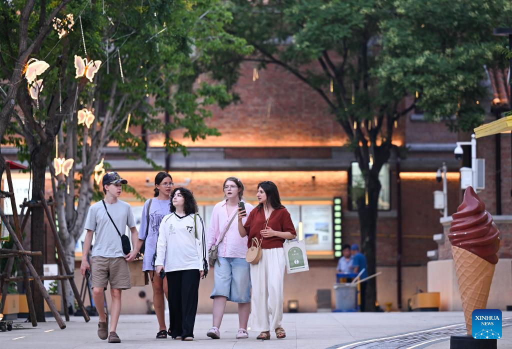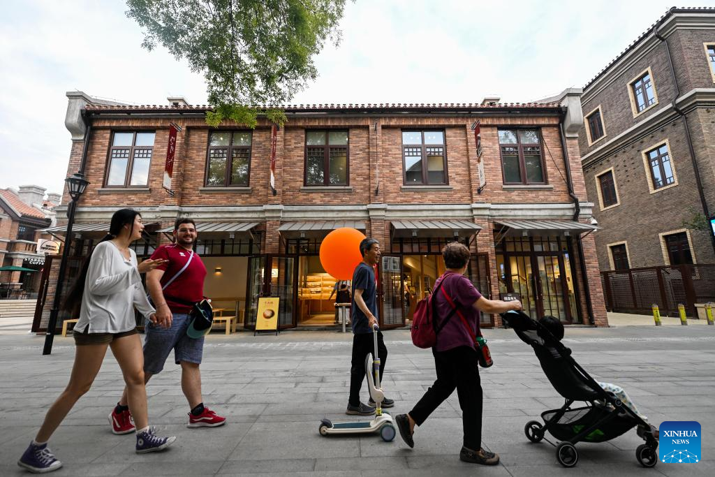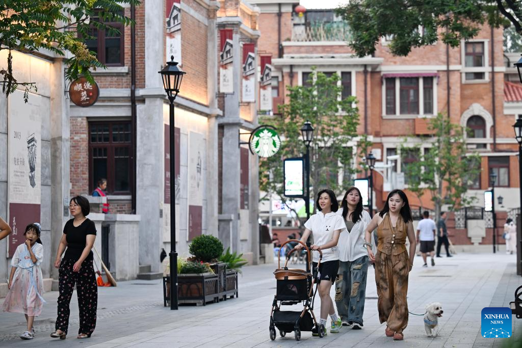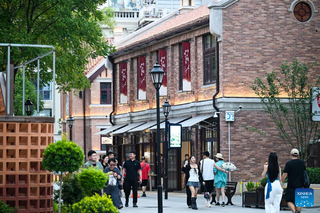 Tourists enjoy leisure time at the Wudadao historical urban area in north China's Tianjin, July 9, 2025. The Minyuan 1920 Block, a recently completed infrastructure enhancement project, has officially opened to the public. The project transforms sections of Hunan Road and Luoyang Avenue into a pedestrian zone and connects Minyuan Square and Wudadao Park, injecting vitality into the century-old historical area. (Xinhua/Zhao Zishuo)