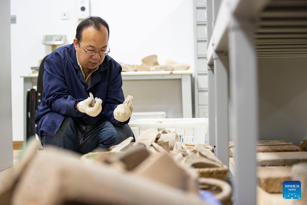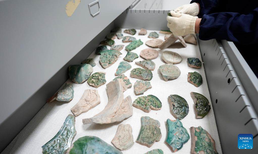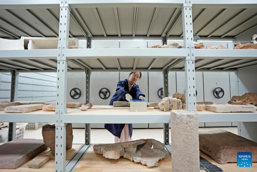 A staff member arranges cultural relics at a storehouse of the Xixia Imperial Tombs in Yinchuan, northwest China's Ningxia Hui Autonomous Region, July 9, 2025. China's Xixia Imperial Tombs were officially added to the UNESCO World Heritage List on Friday during the 47th session of the World Heritage Committee held in Paris, France. The inscription brings the total number of World Heritage sites in China to 60. (Xinhua/Yang Zhisen)