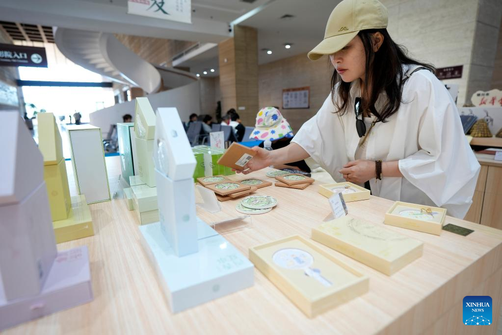 A tourist picks cultural and creative products at the Xixia Imperial Tombs Museum in Yinchuan, northwest China's Ningxia Hui Autonomous Region, July 9, 2025. China's Xixia Imperial Tombs were officially added to the UNESCO World Heritage List on Friday during the 47th session of the World Heritage Committee held in Paris, France. The inscription brings the total number of World Heritage sites in China to 60. (Xinhua/Wang Peng)