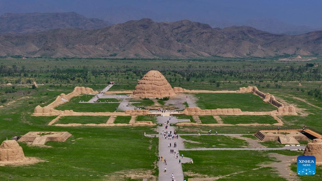 An aerial drone photo taken on July 10, 2025 shows people visiting the Xixia Imperial Tombs scenic area in Yinchuan, northwest China's Ningxia Hui Autonomous Region. China's Xixia Imperial Tombs were officially added to the UNESCO World Heritage List on Friday during the 47th session of the World Heritage Committee held in Paris, France. The inscription brings the total number of World Heritage sites in China to 60. (Xinhua/Feng Kaihua)