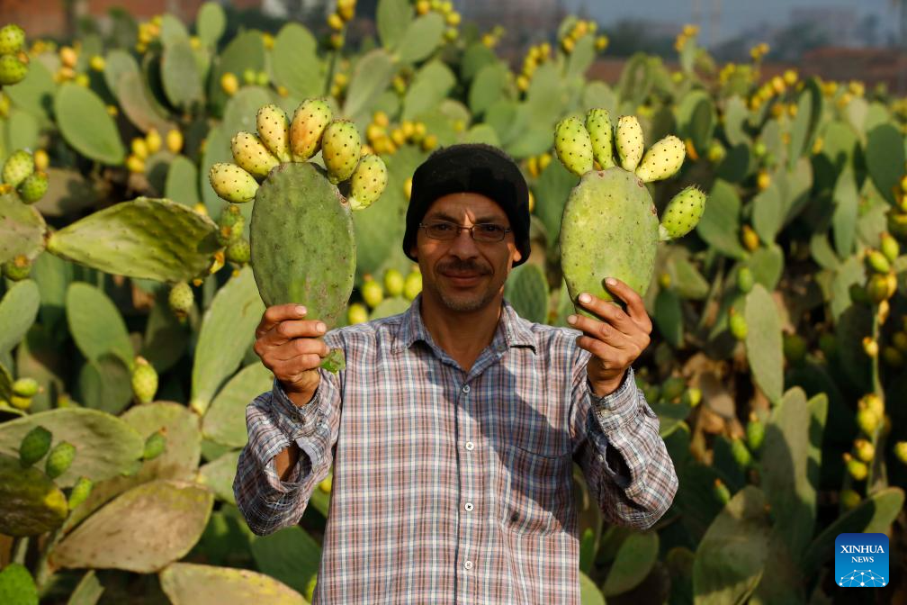 A farmer displays prickly pears at a farm in Qalyubia Governorate, Egypt, on July 11, 2025. (Xinhua/Ahmed Gomaa)