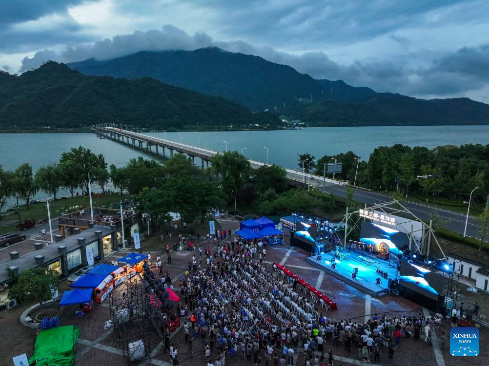 An aerial drone photo taken on July 11, 2025 shows a scene of a musical performance during the village summer musical season in Sandu Township, Jiande City, east China's Zhejiang Province. (Xinhua/Xu Yu)