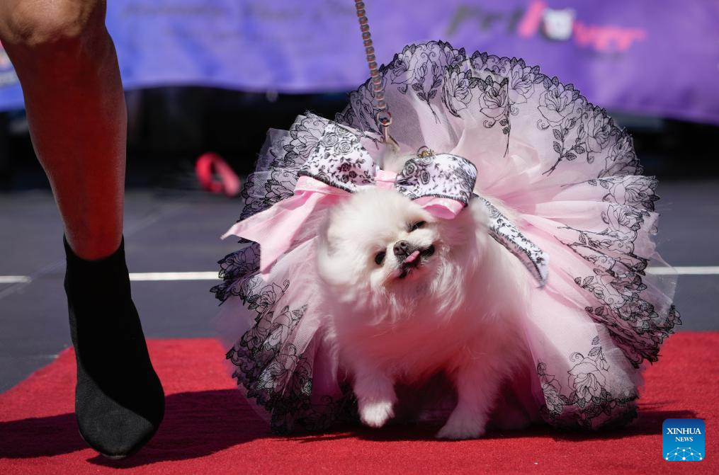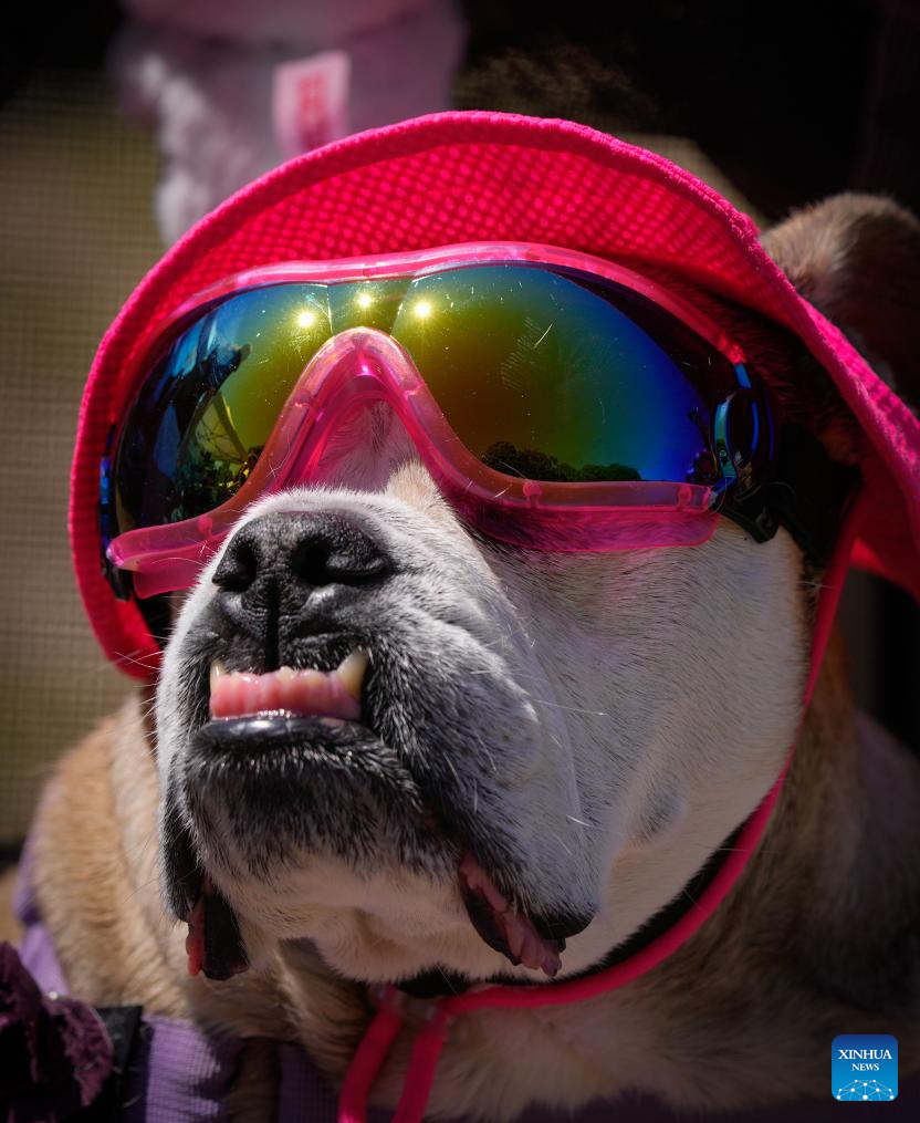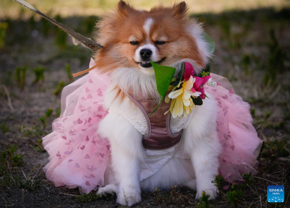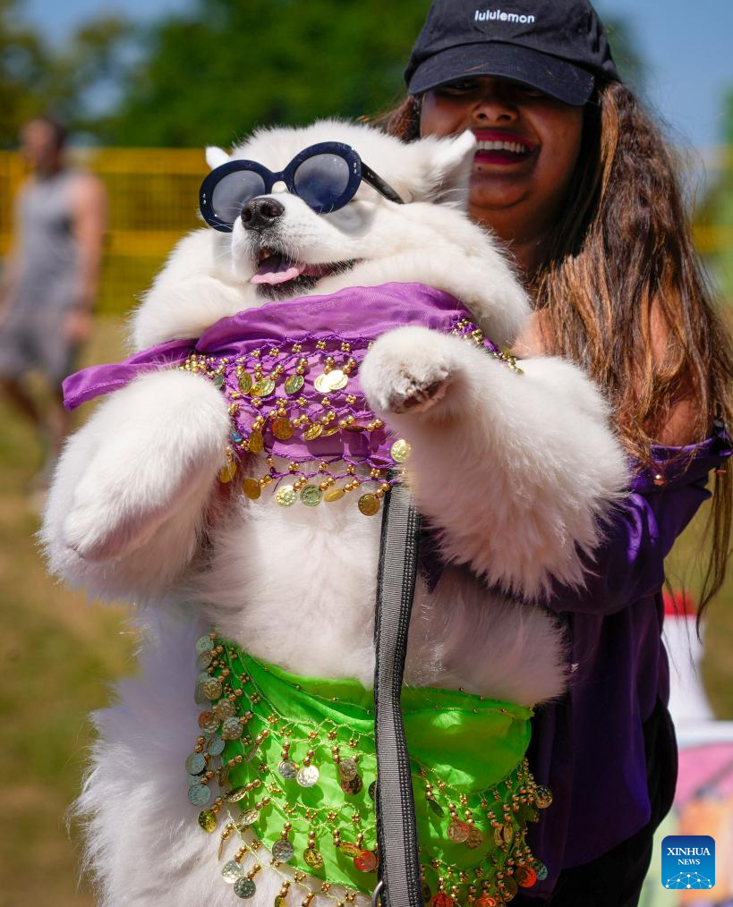 A dressed up dog is seen during a dog fashion show in Vancouver, Canada, July 12, 2025. An outdoor pet festival kicked off here on Saturday, featuring a dog fashion show. (Photo by Liang Sen/Xinhua)