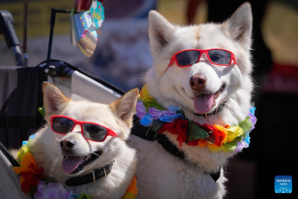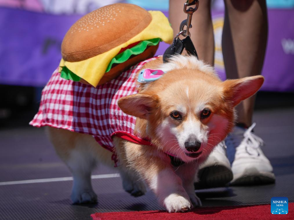 Dressed up dogs are seen during a dog fashion show in Vancouver, Canada, July 12, 2025. An outdoor pet festival kicked off here on Saturday, featuring a dog fashion show. (Photo by Liang Sen/Xinhua)