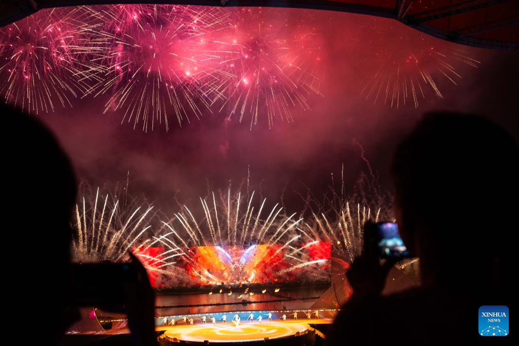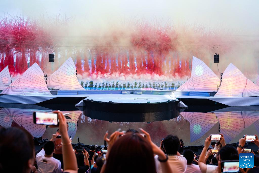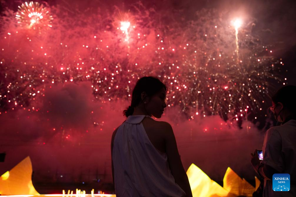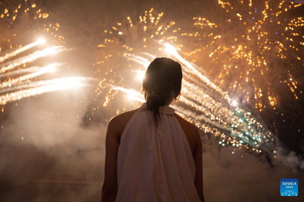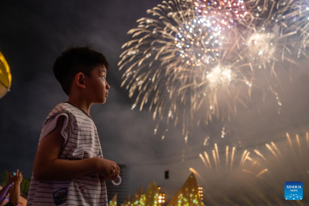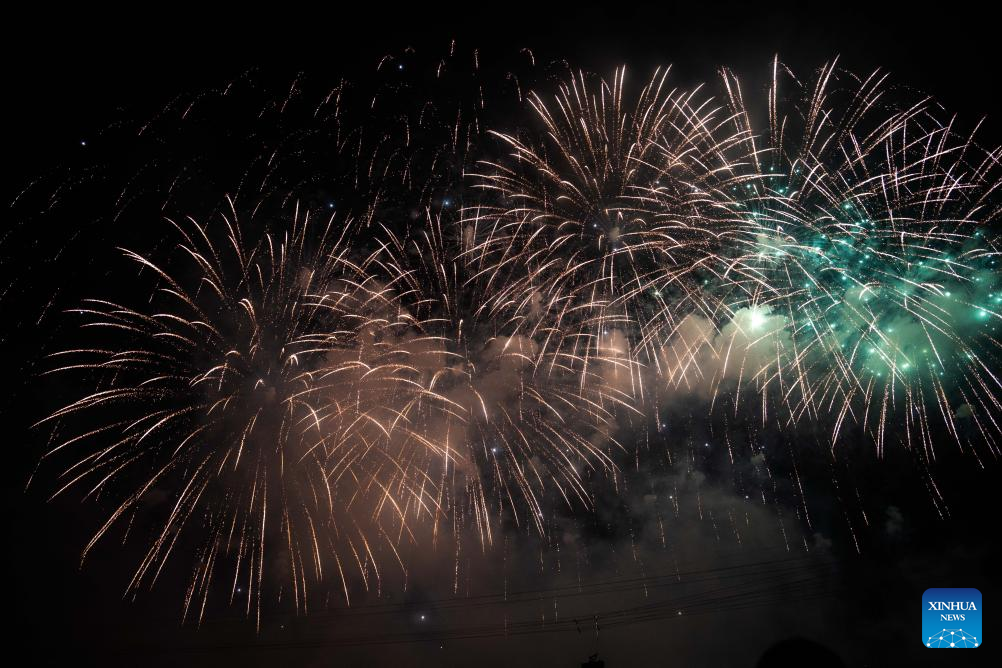 Tourists enjoy a creative fireworks show in Liuyang City, central China's Hunan Province, July 12, 2025. Liuyang, a small city known as China's "fireworks capital," has organized 26 creative fireworks events in the first half of 2025. These events have attracted over 1.5 million tourists in total, stimulating consumer spending of nearly 4 billion yuan (about 558 million U.S. dollars). (Xinhua/Chen Sihan)