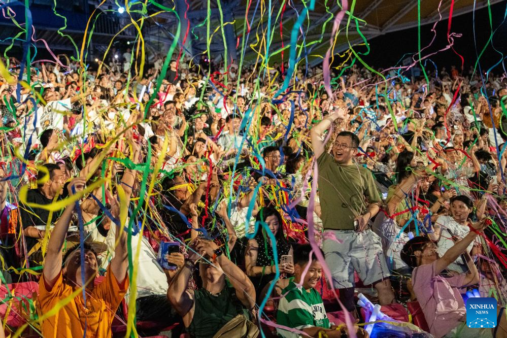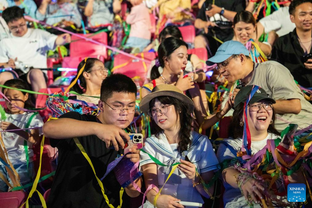 Tourists cheer during a creative fireworks show in Liuyang City, central China's Hunan Province, July 12, 2025. Liuyang, a small city known as China's "fireworks capital," has organized 26 creative fireworks events in the first half of 2025. These events have attracted over 1.5 million tourists in total, stimulating consumer spending of nearly 4 billion yuan (about 558 million U.S. dollars). (Xinhua/Chen Sihan)