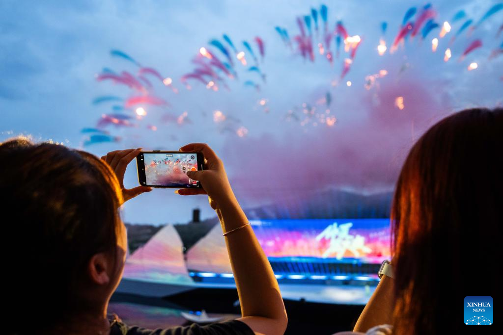 Tourists take photos during a creative fireworks show in Liuyang City, central China's Hunan Province, July 12, 2025. Liuyang, a small city known as China's "fireworks capital," has organized 26 creative fireworks events in the first half of 2025. These events have attracted over 1.5 million tourists in total, stimulating consumer spending of nearly 4 billion yuan (about 558 million U.S. dollars). (Xinhua/Chen Sihan)
