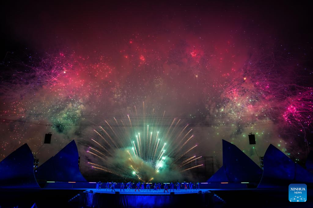 This photo taken on July 12, 2025 shows a scene of a creative fireworks show in Liuyang City, central China's Hunan Province. Liuyang, a small city known as China's "fireworks capital," has organized 26 creative fireworks events in the first half of 2025. These events have attracted over 1.5 million tourists in total, stimulating consumer spending of nearly 4 billion yuan (about 558 million U.S. dollars). (Xinhua/Chen Sihan)