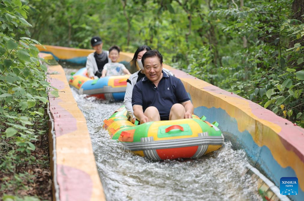 Tourists enjoy rafting at a scenic spot in Linyi, east China's Shandong Province, July 13, 2025. With heatwaves hitting some Chinese provinces and regions in recent days, the scorching temperature has fueled a cooling economy boom. (Photo by Wang Yanbing/Xinhua)