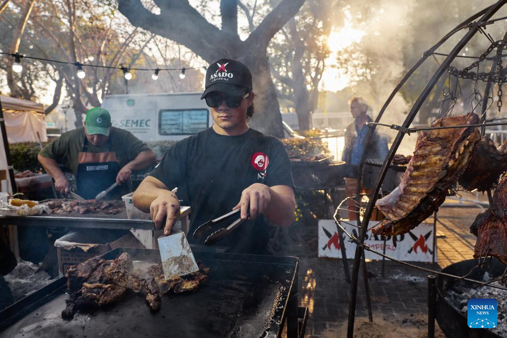 Staff members roast meat at a food festival in Buenos Aires, Argentina, on July 12, 2025. A two-day food festival was held to celebrate Argentina's Independence Day in Buenos Aires. (Xinhua/Meng Dingbo)
