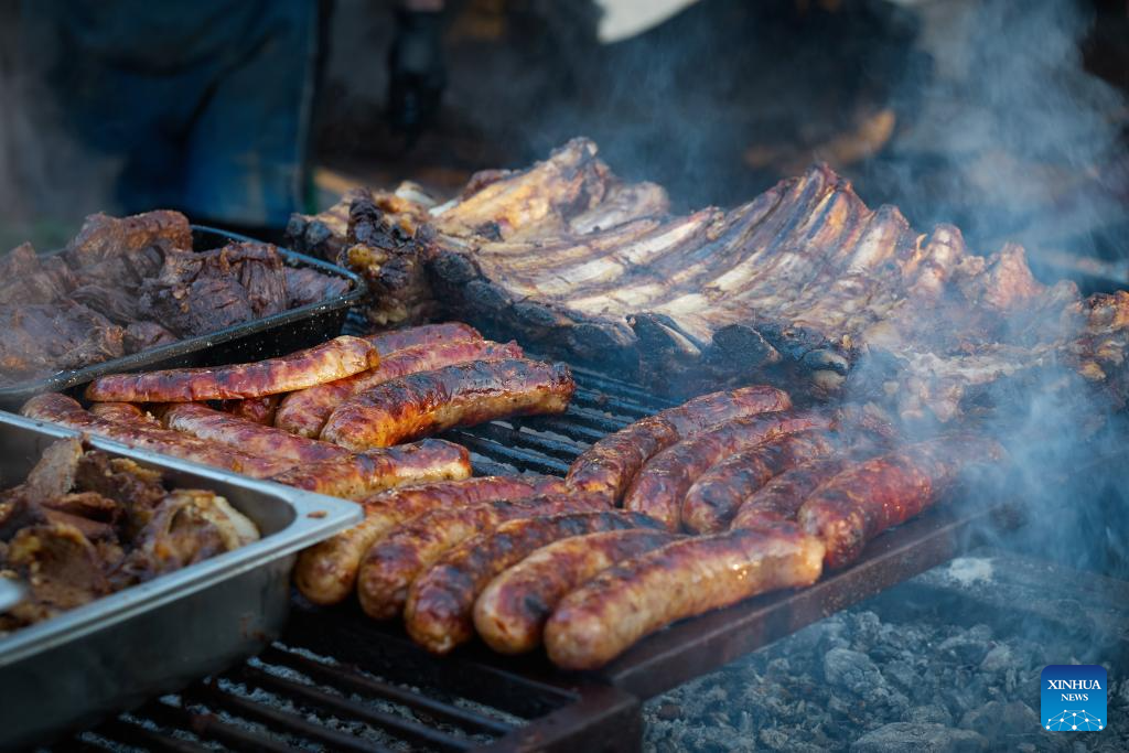 This photo taken on July 12, 2025 shows roasted meat at a food festival in Buenos Aires, Argentina. A two-day food festival was held to celebrate Argentina's Independence Day in Buenos Aires. (Xinhua/Meng Dingbo)