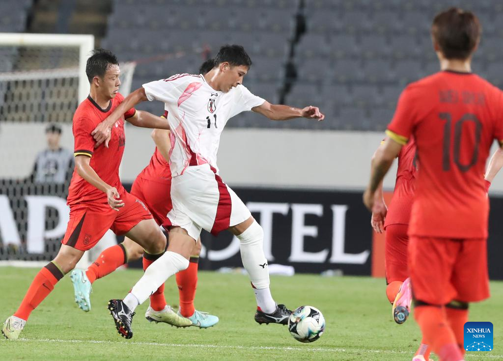 Hosoya Mao (2nd L) of Japan vies for the ball during the men's match between China and Japan at the EAFF (East Asian Football Federation) E-1 Football Championship 2025 Final in Yongin, South Korea, July 12, 2025. (Xinhua/Yao Qilin)