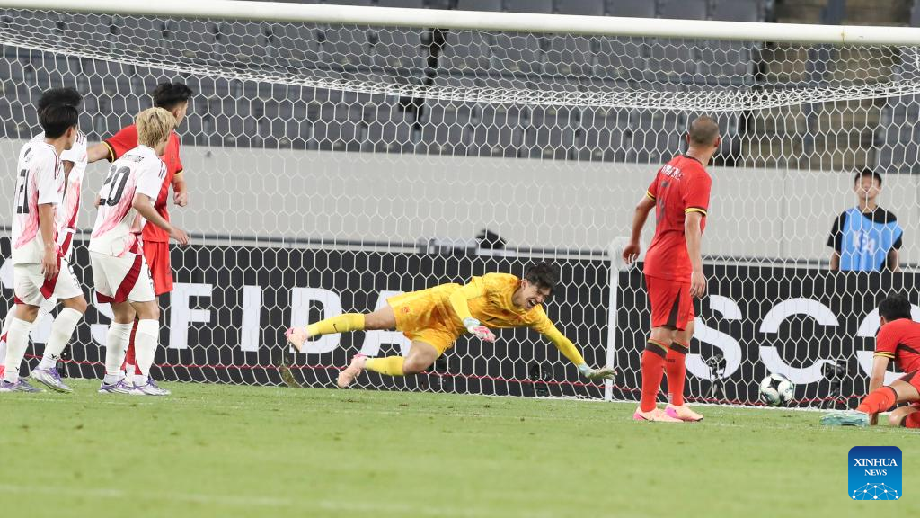 Goalkeeper Yan Junling (C) of China fails to save the ball during the men's match between China and Japan at the EAFF (East Asian Football Federation) E-1 Football Championship 2025 Final in Yongin, South Korea, July 12, 2025. (Xinhua/Yao Qilin)