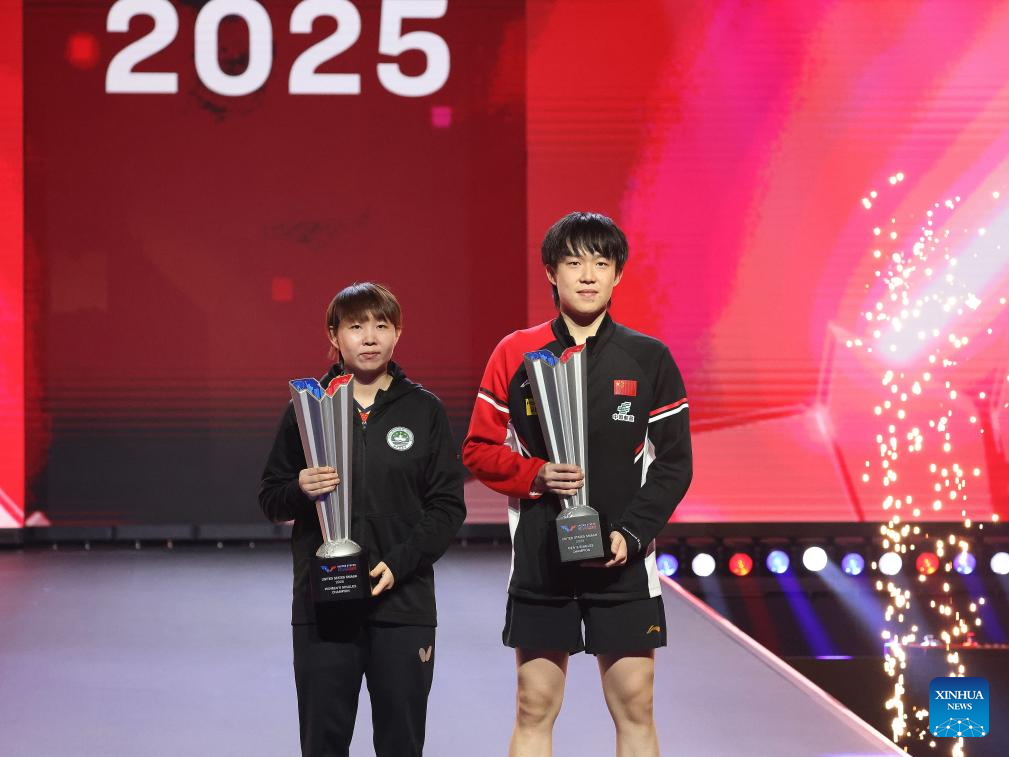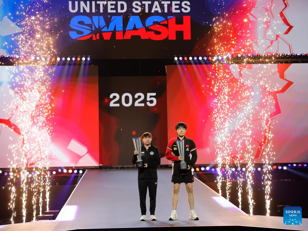 Wang Chuqin (R) of China, winner for men's singles and Zhu Yuling of China's Macao, winner for women's singles, pose with their trophies during the awarding ceremony after their final match at the WTT United States Smash 2025 in Las Vegas, the United States, July 13, 2025. (Photo by Qiu Chen/Xinhua)