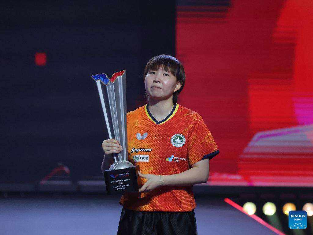 Zhu Yuling poses with trophy during the awarding ceremony for the women's singles final match between Zhu Yuling of China's Macao and Chen Yi of China at the WTT United States Smash 2025 in Las Vegas, the United States, July 13, 2025. (Photo by Qiu Chen/Xinhua)