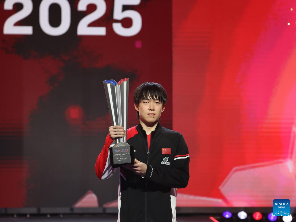 Wang Chuqin poses with trophy during the awarding ceremony for the men's singles final match between Wang Chuqin of China and Harimoto Tomokazu of Japan at the WTT United States Smash 2025 in Las Vegas, the United States, July 13, 2025. (Photo by Qiu Chen/Xinhua)