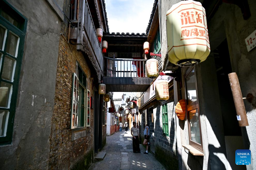This photo taken on July 13, 2025 shows a view of Taoyangli historical and cultural block in Jingdezhen City, east China's Jiangxi Province. Located in the heart of Jingdezhen, Taoyangli has successfully transformed from an old district into a thriving hub for cultural innovation and tourism in recent years. Today, it has become a must-visit destination for tourists. (Xinhua/Liu Jinhai)