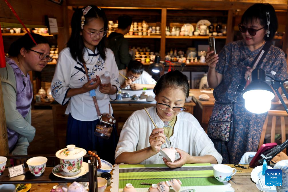 Tourists shop for handmade ceramic products in Taoyangli historical and cultural block in Jingdezhen City, east China's Jiangxi Province, July 13, 2025. Located in the heart of Jingdezhen, Taoyangli has successfully transformed from an old district into a thriving hub for cultural innovation and tourism in recent years. Today, it has become a must-visit destination for tourists. (Xinhua/Liu Jinhai)