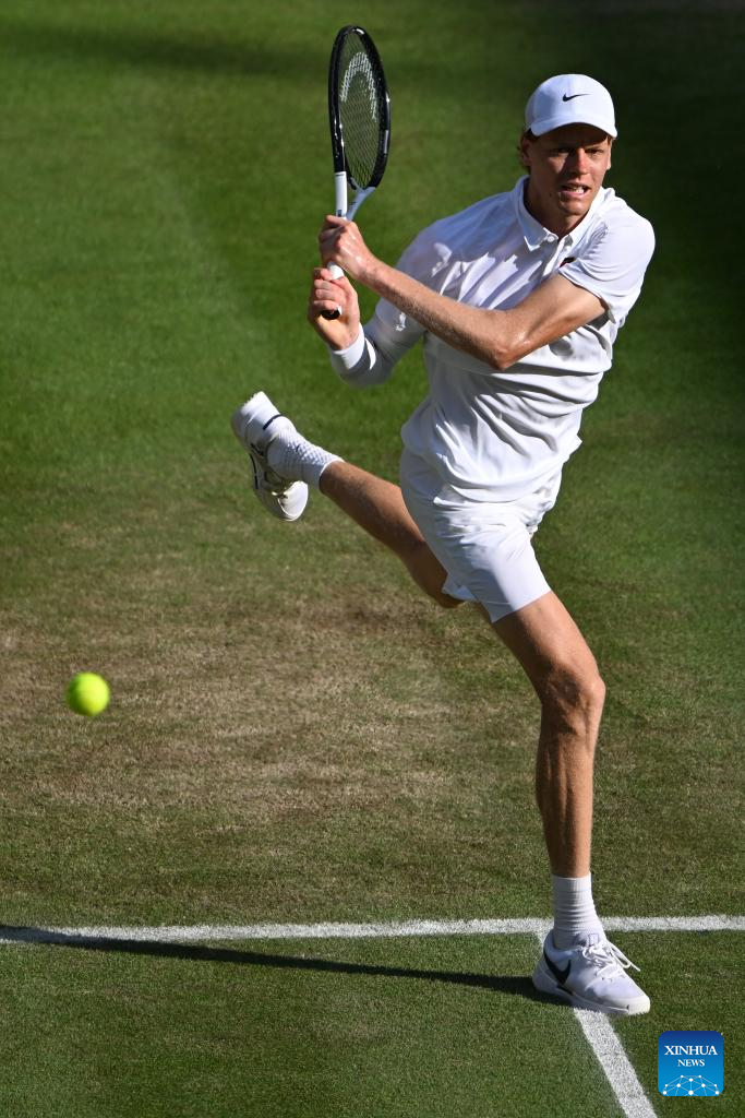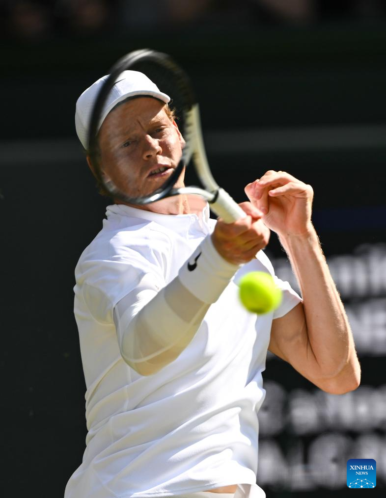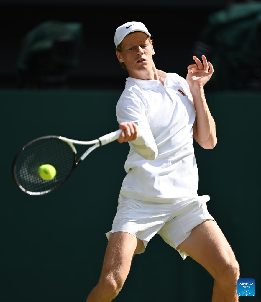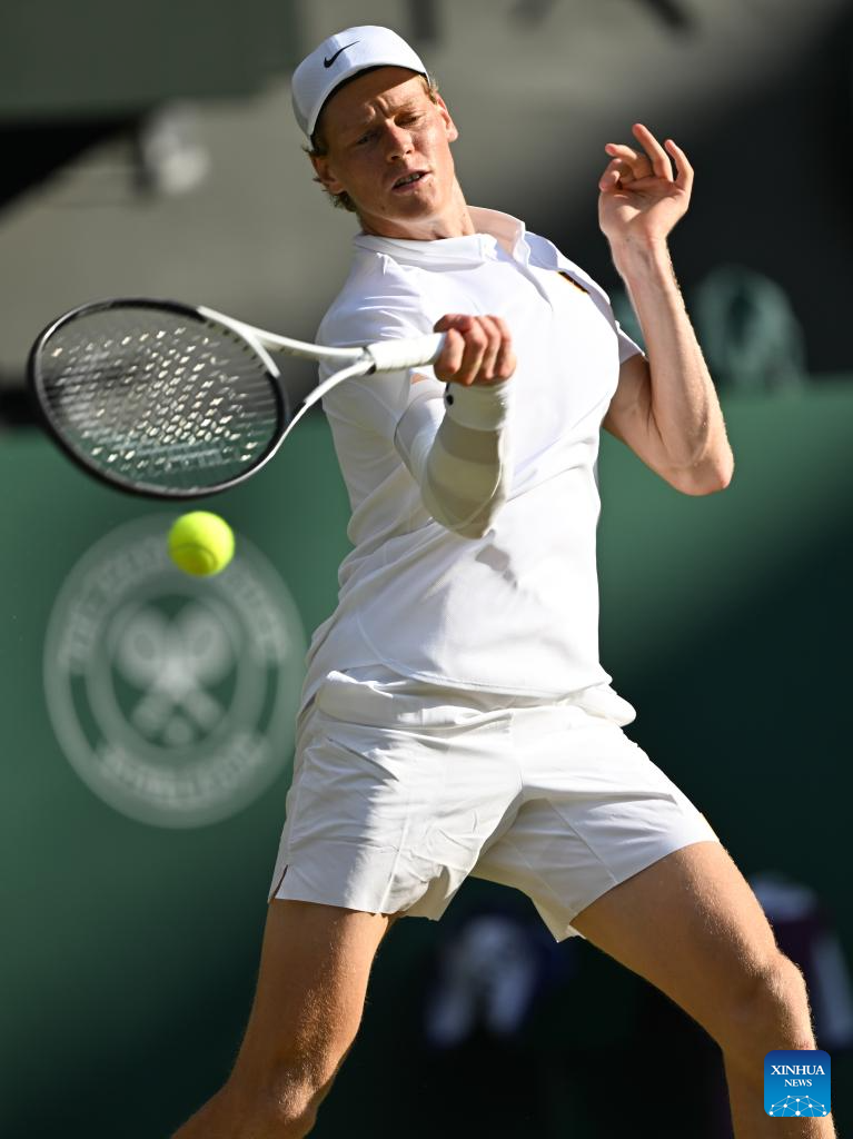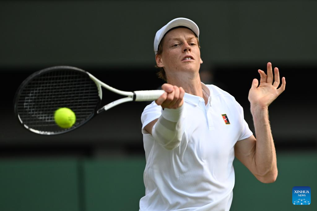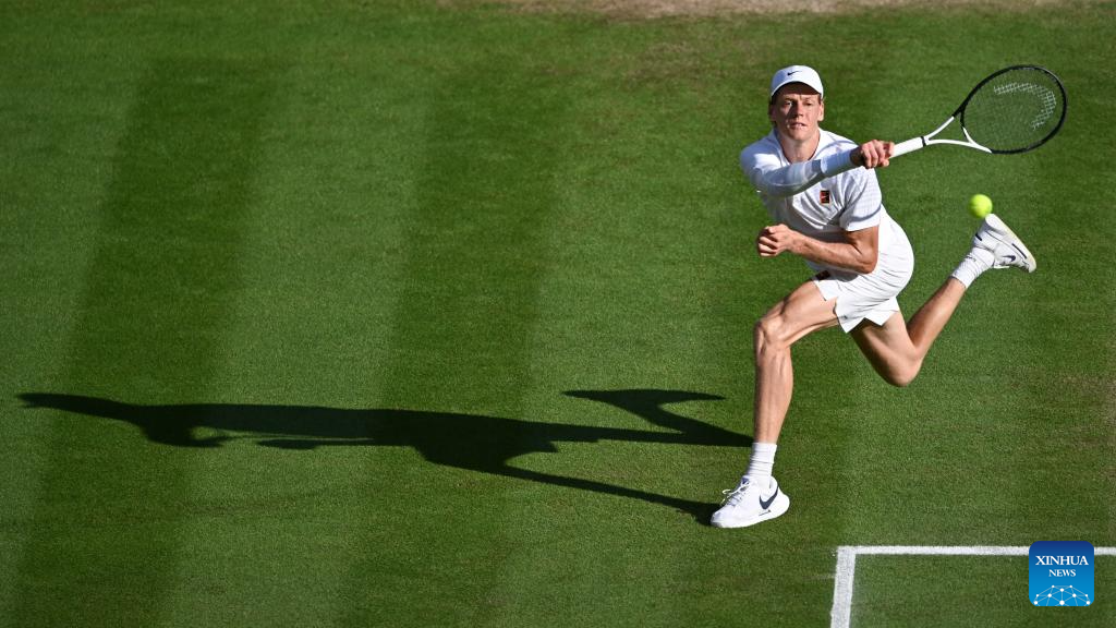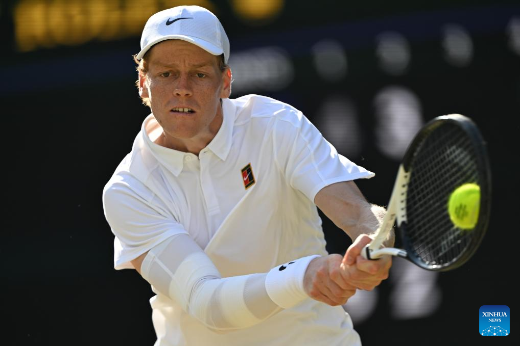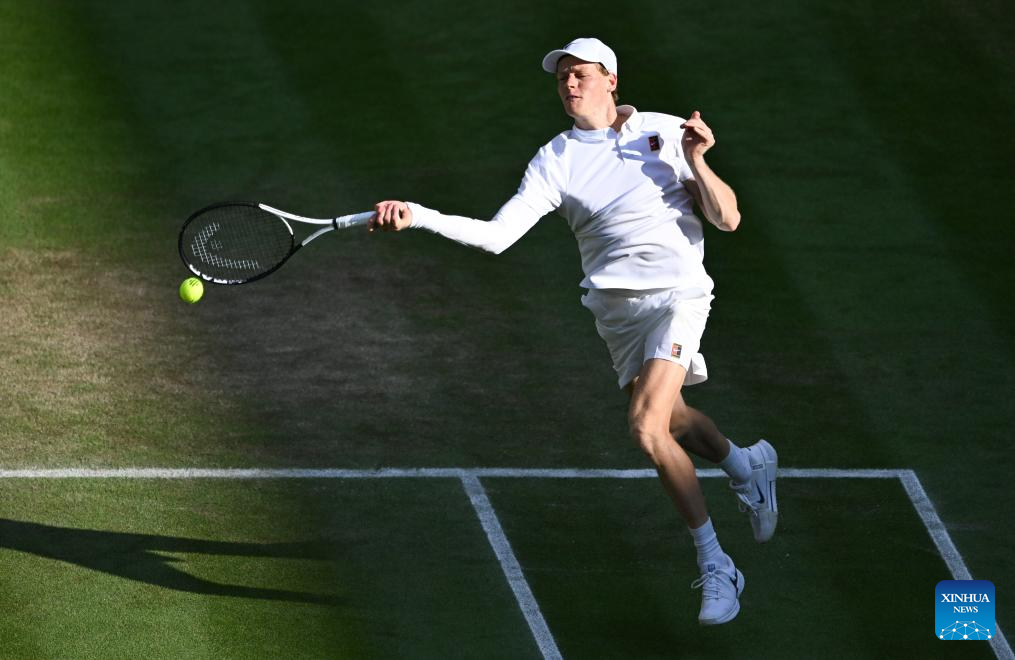 Jannik Sinner hits a return during the men's singles final between Carlos Alcaraz of Spain and Jannik Sinner of Italy at the Wimbledon Tennis Championships in London, Britain, July 13, 2025. (Xinhua/Zhao Dingzhe)