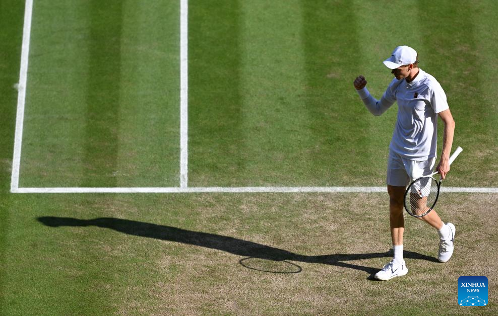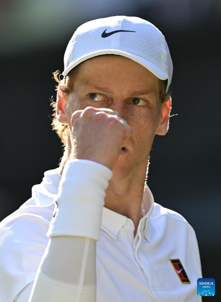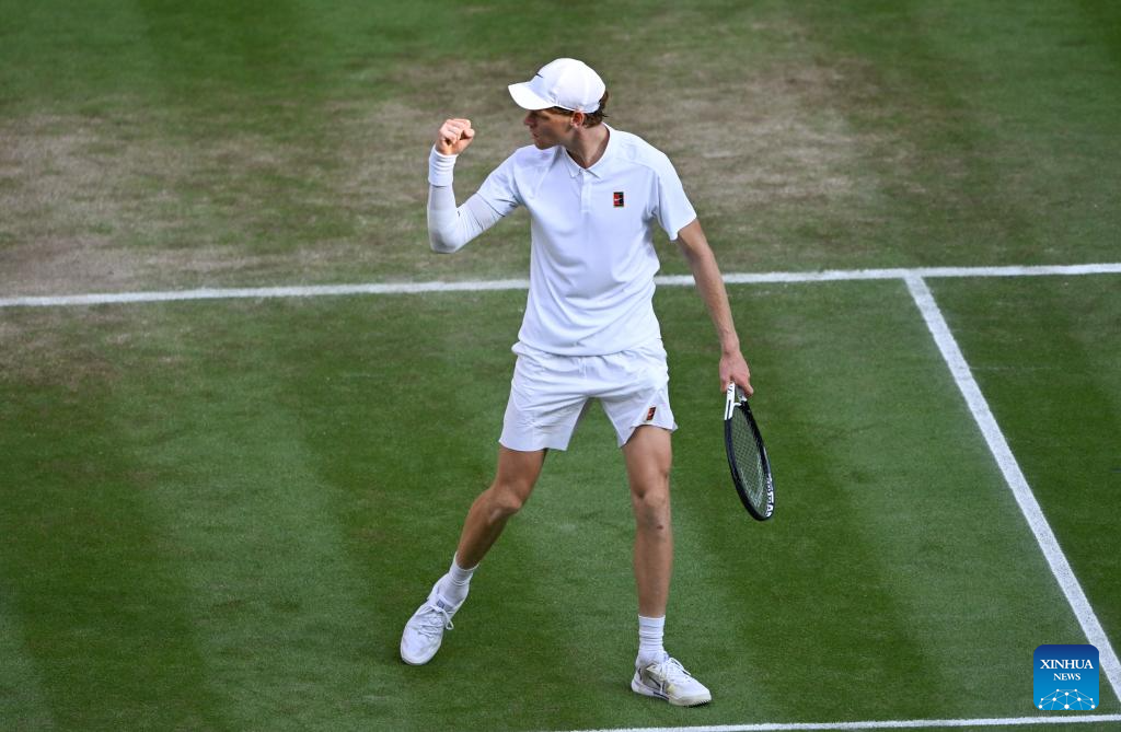Jannik Sinner celebrates scoring during the men's singles final between Carlos Alcaraz of Spain and Jannik Sinner of Italy at the Wimbledon Tennis Championships in London, Britain, July 13, 2025. (Xinhua/Li Ying)