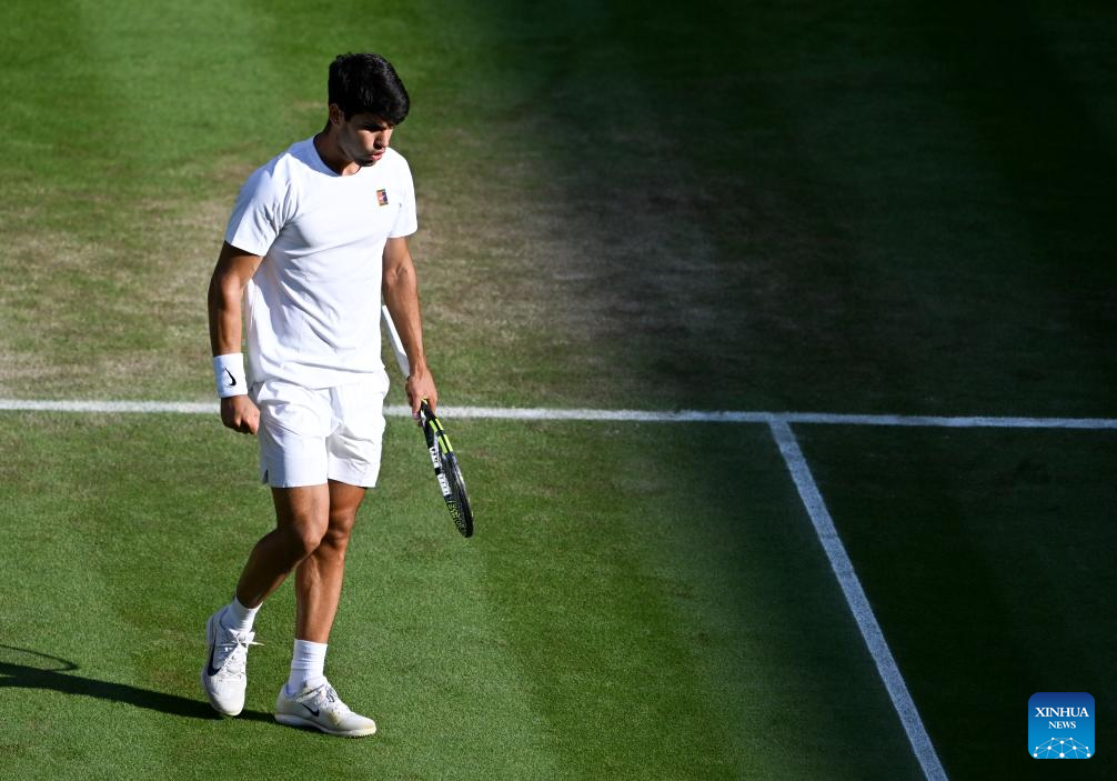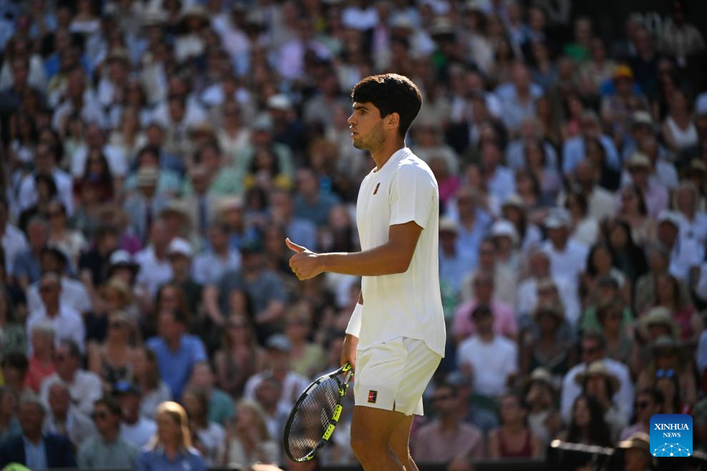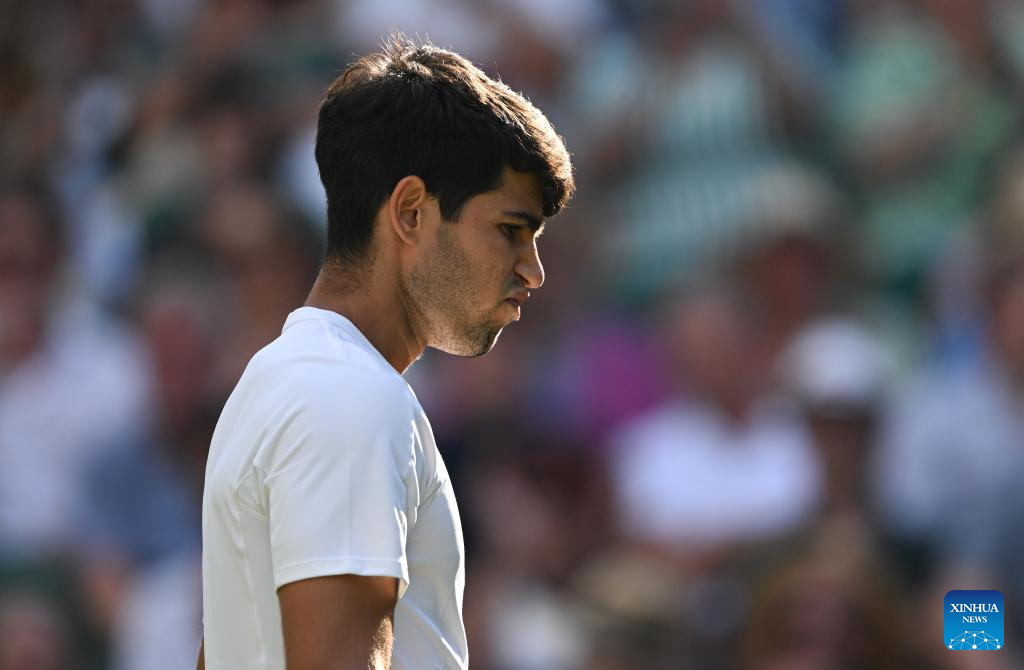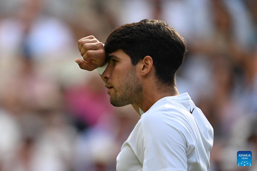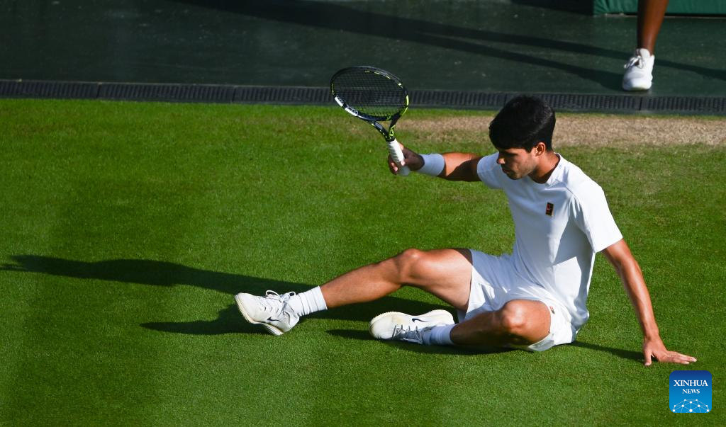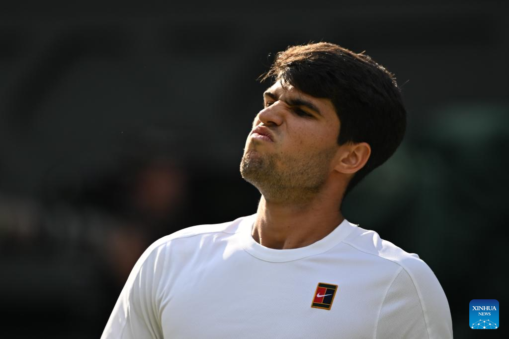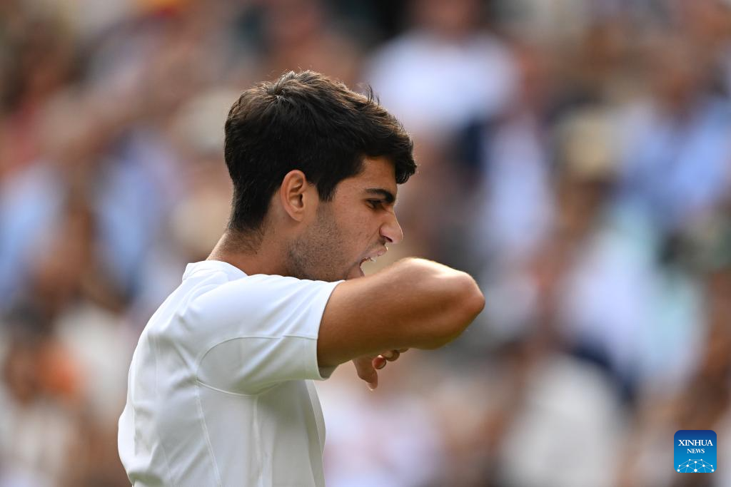 Carlos Alcaraz reacts during the men's singles final between Carlos Alcaraz of Spain and Jannik Sinner of Italy at the Wimbledon Tennis Championships in London, Britain, July 13, 2025. (Xinhua/Li Ying)