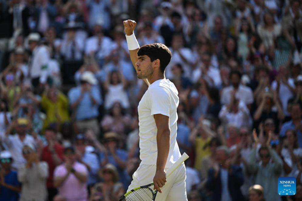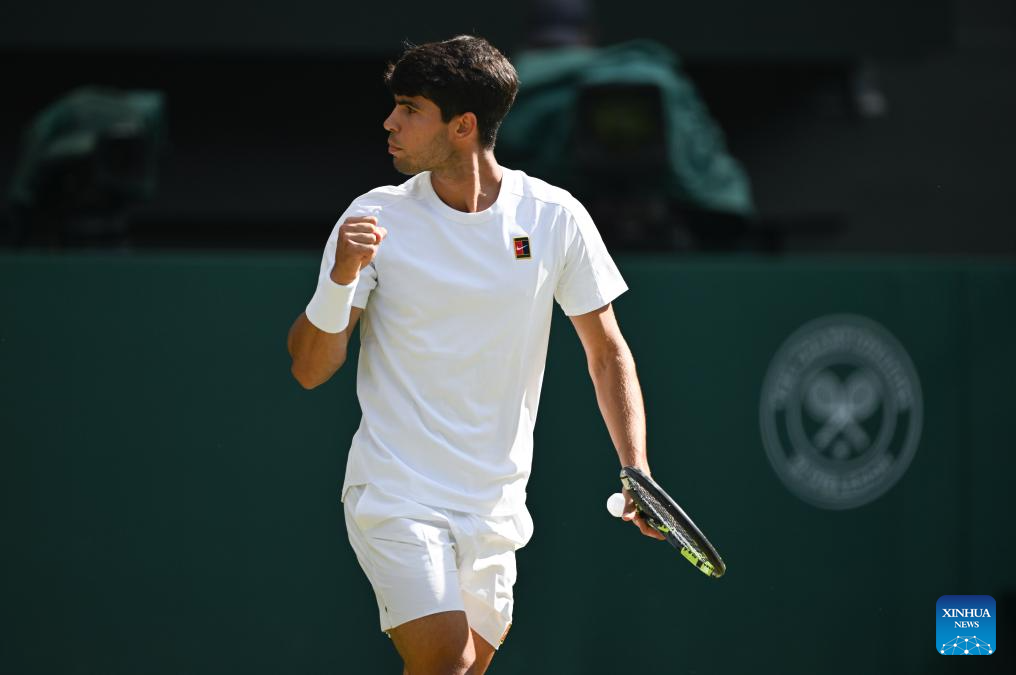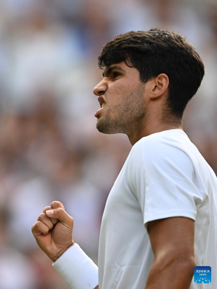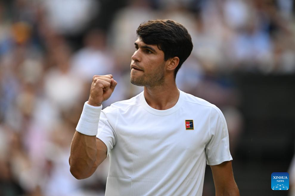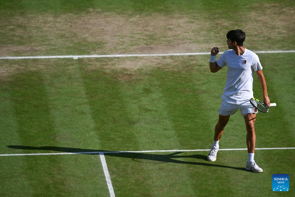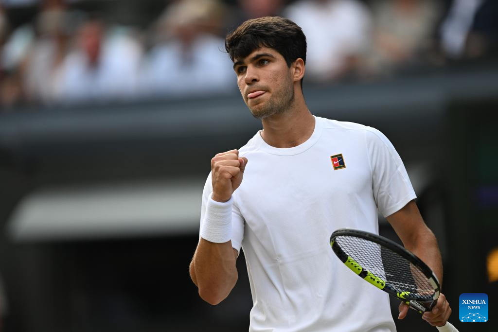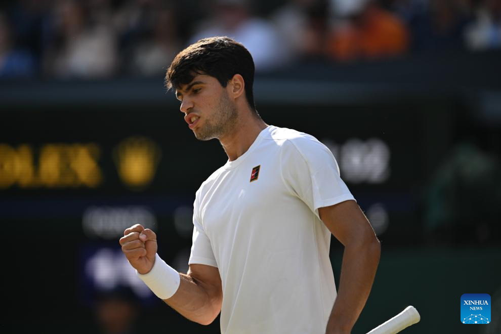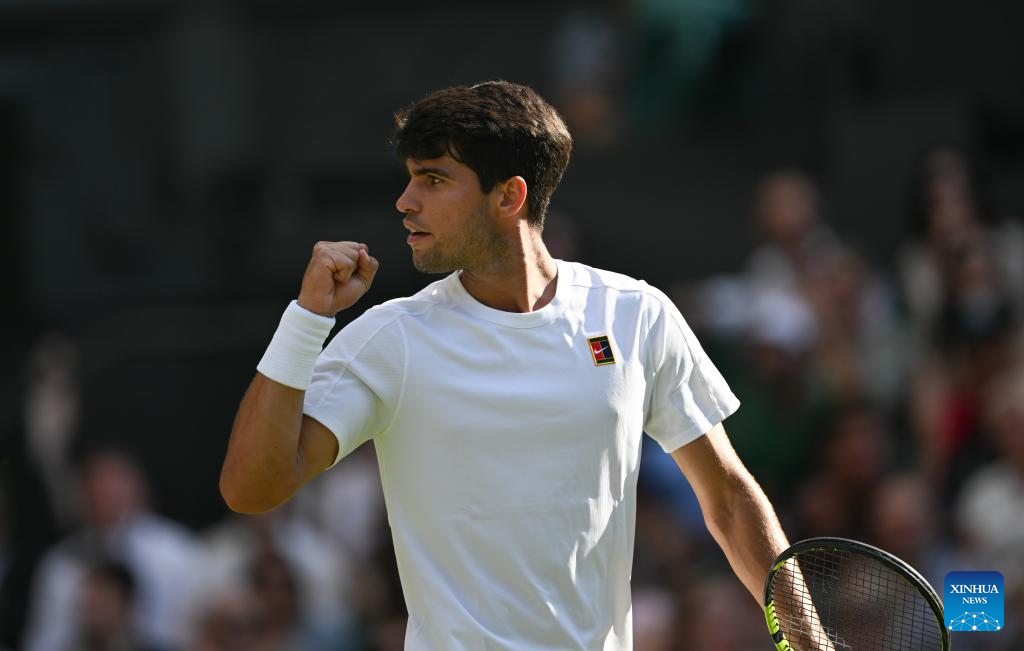 Carlos Alcaraz celebrates scoring during the men's singles final between Carlos Alcaraz of Spain and Jannik Sinner of Italy at the Wimbledon Tennis Championships in London, Britain, July 13, 2025. (Xinhua/Li Ying)