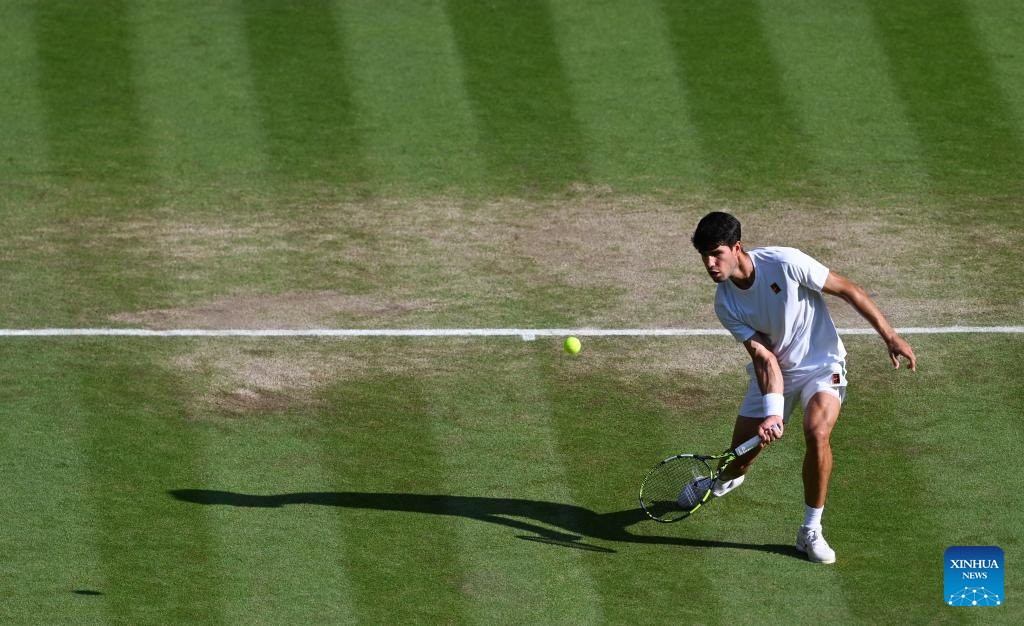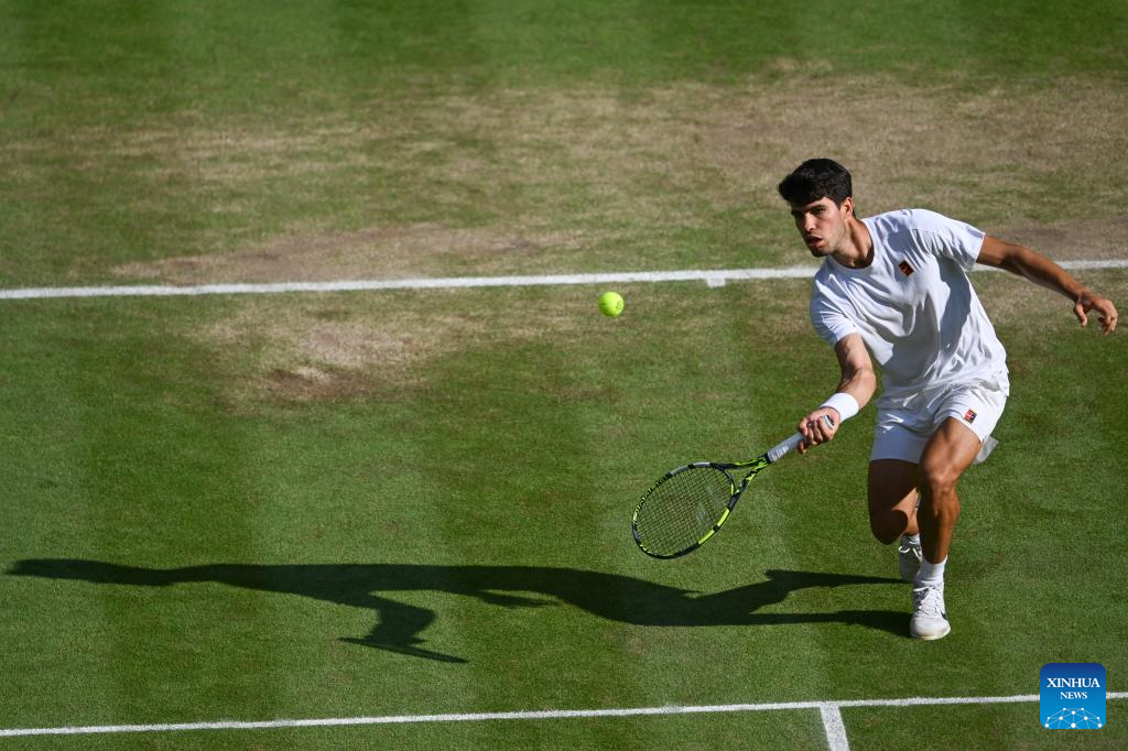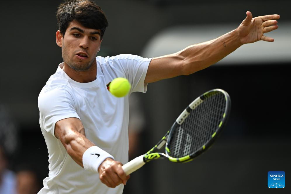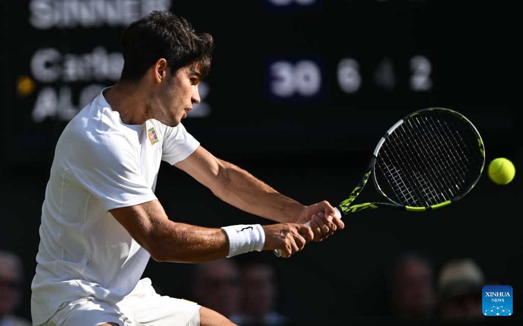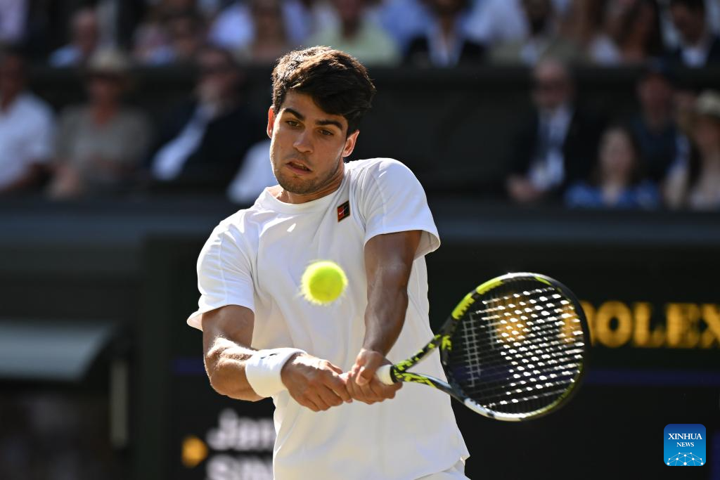 Carlos Alcaraz hits a return during the men's singles final between Carlos Alcaraz of Spain and Jannik Sinner of Italy at the Wimbledon Tennis Championships in London, Britain, July 13, 2025. (Xinhua/Zhao Dingzhe)