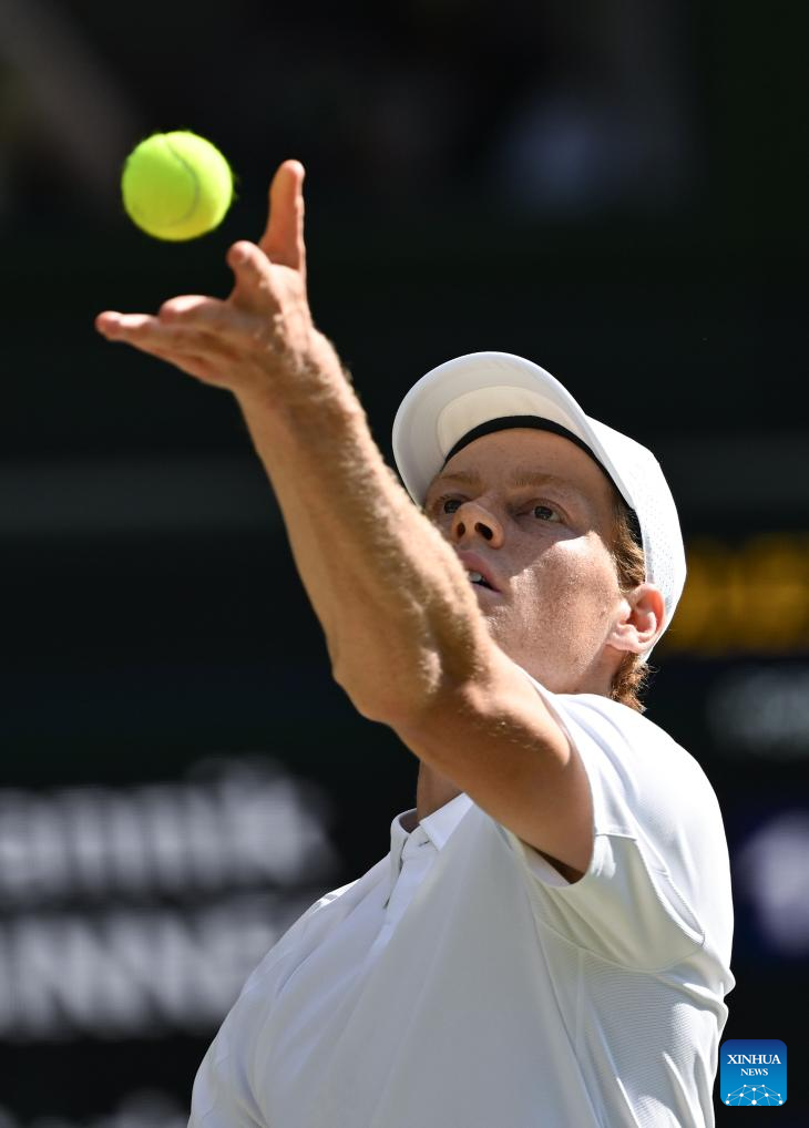 Jannik Sinner serves during the men's singles final between Carlos Alcaraz of Spain and Jannik Sinner of Italy at the Wimbledon Tennis Championships in London, Britain, July 13, 2025. (Xinhua/Li Ying)