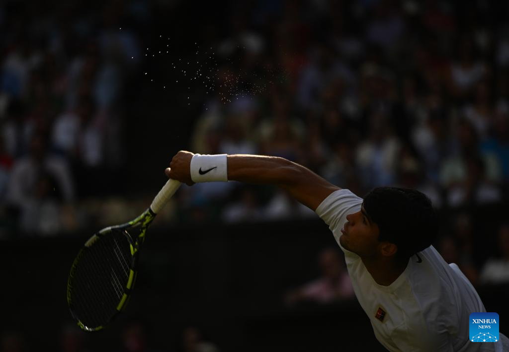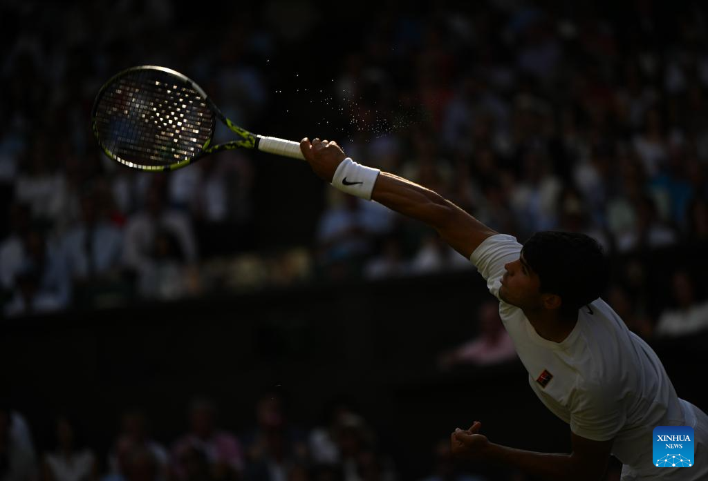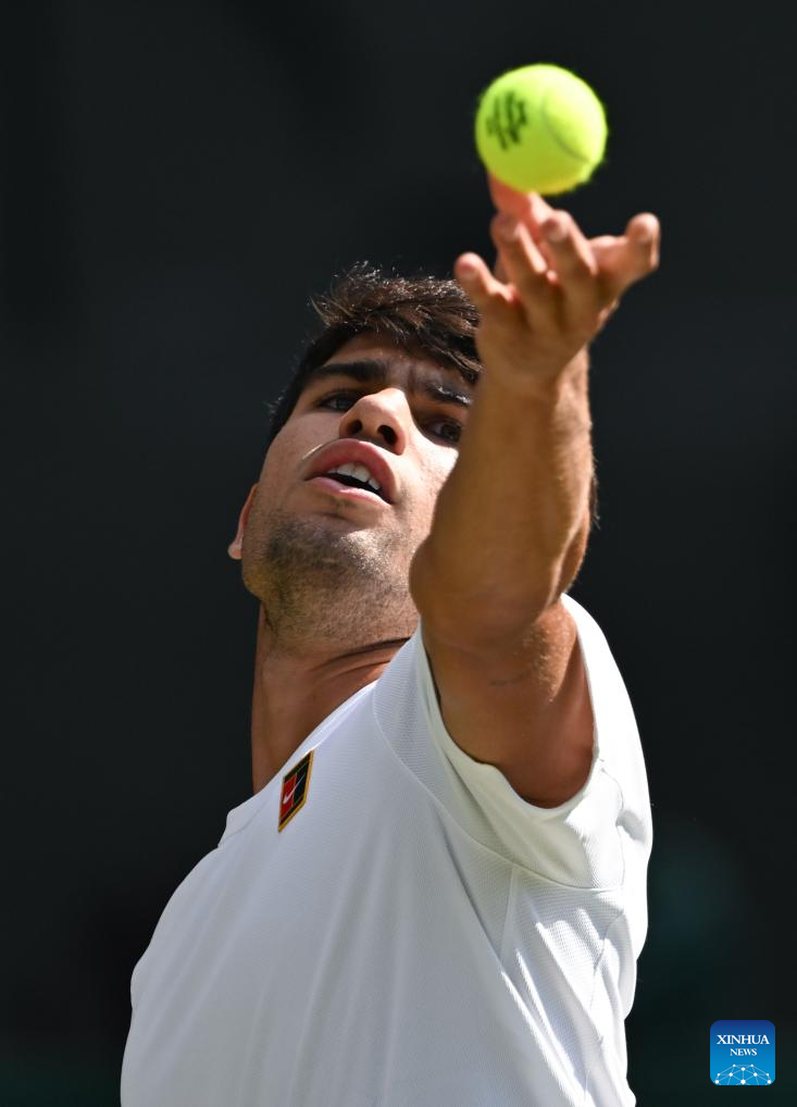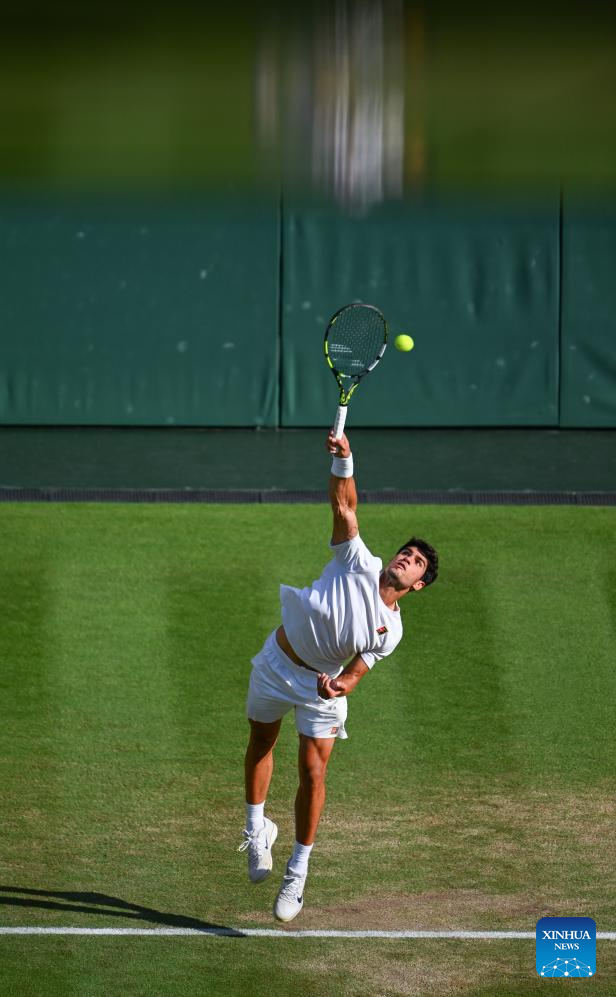 Carlos Alcaraz serves during the men's singles final between Carlos Alcaraz of Spain and Jannik Sinner of Italy at the Wimbledon Tennis Championships in London, Britain, July 13, 2025. (Xinhua/Li Ying)