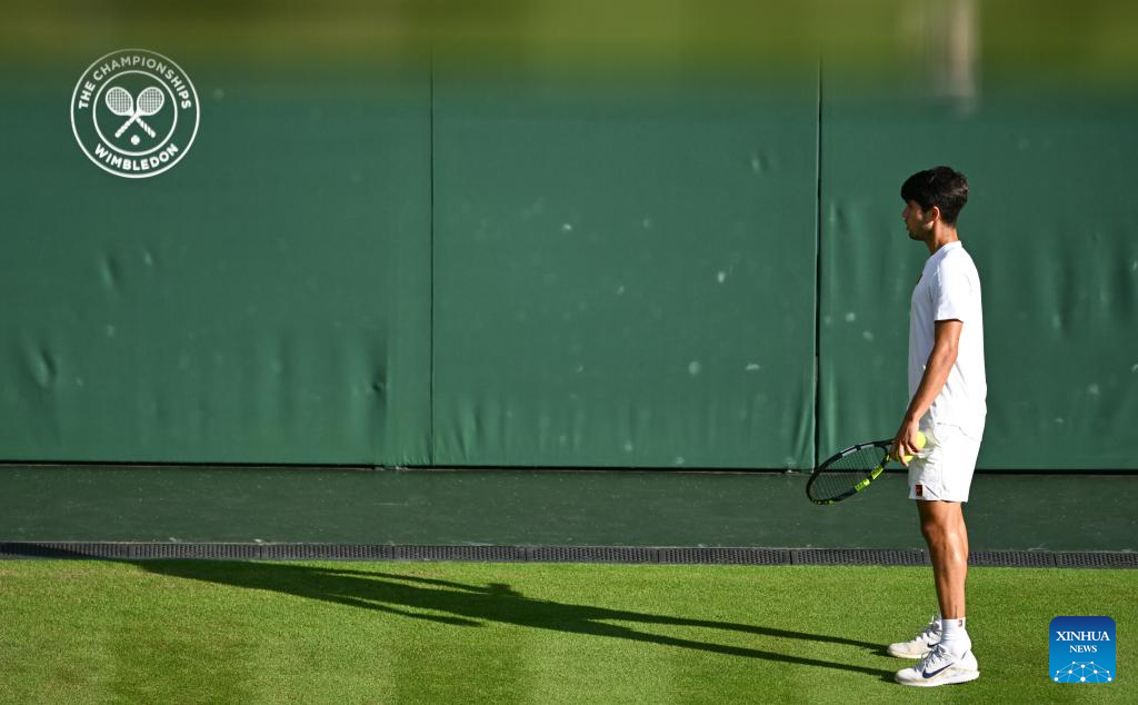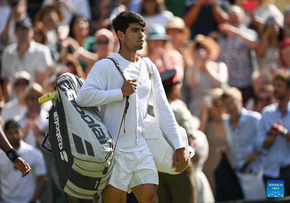 Carlos Alcaraz walks into the court before the men's singles final between Carlos Alcaraz of Spain and Jannik Sinner of Italy at the Wimbledon Tennis Championships in London, Britain, July 13, 2025. (Xinhua/Li Ying)